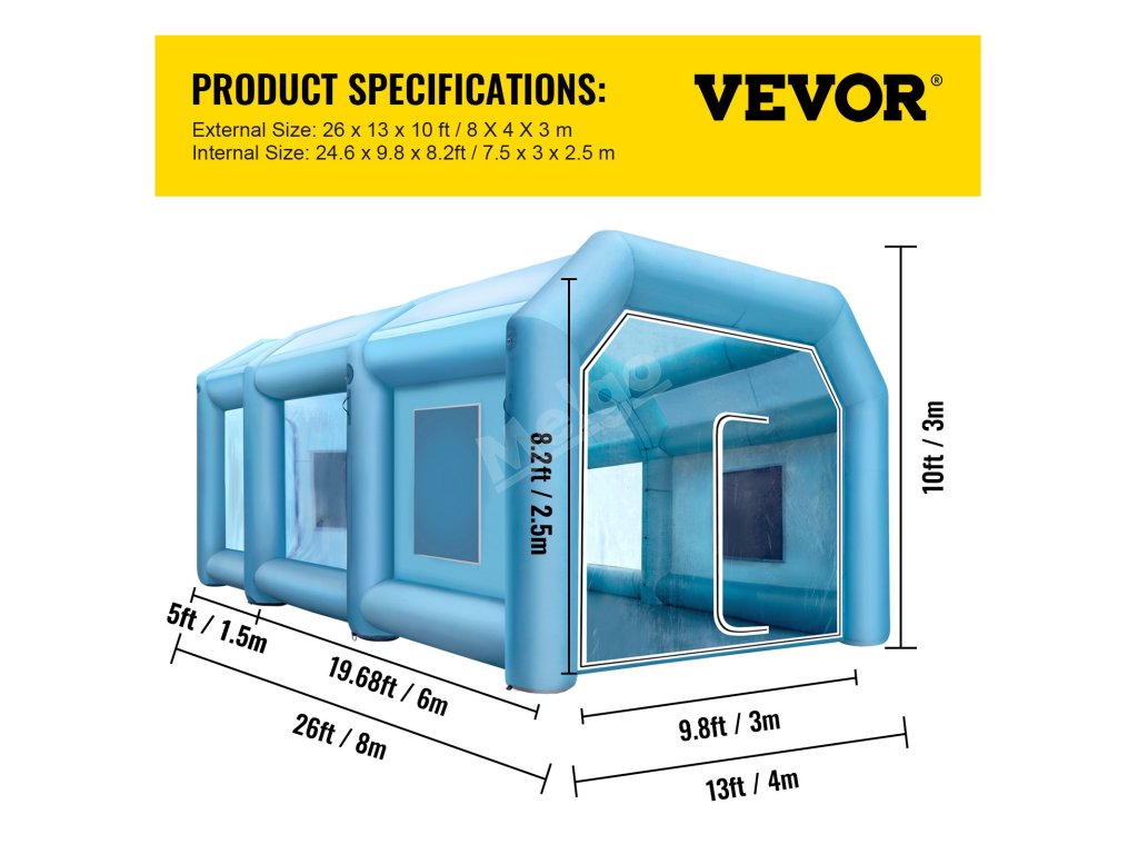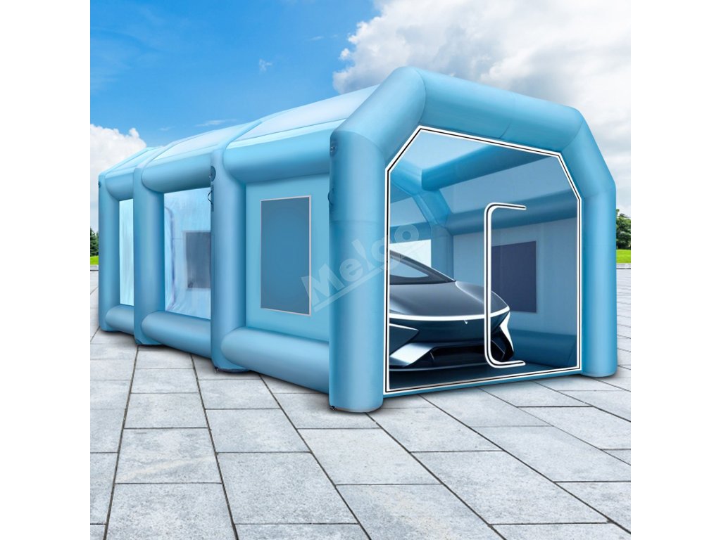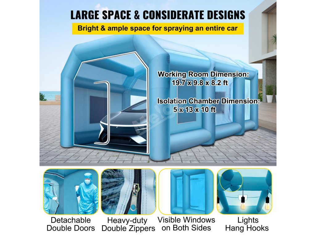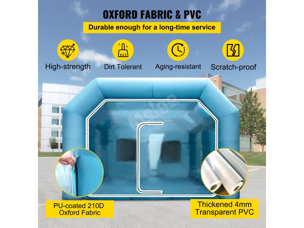 Nafukovací lakovací kabina využívá tkaninu Oxford 210D a materiál PVC, který je odolný, neroztrhne se a je odolný proti znečištění. Její vnější rozměry: 26 x 13 x 10 stop Je dostatečně prostorná, aby se do ní vešel automobil nebo motocykl, který potřebuje natřít.