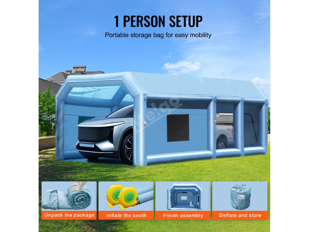 Přenosná nafukovací lakovací kabina se snadno skládá a ukládá do přiložené tašky pro bezproblémovou přepravu a mobilitu. Ať už pracujete venku nebo se přesouváte mezi jednotlivými místy, poskytuje bezkonkurenční pohodlí.