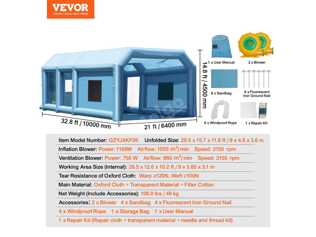 Nafukovací stříkací kabina 10×6.4×4.5 m, 1100W+750W ventilátory