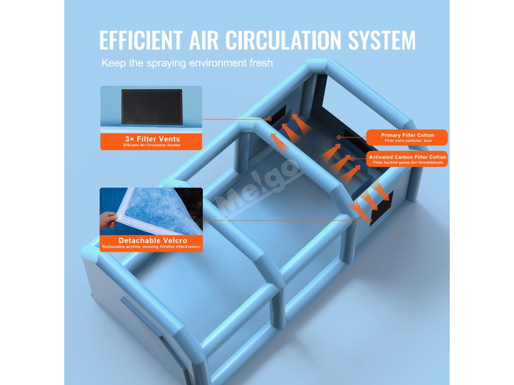 Nafukovací stříkací kabina vybavená dvouvrstvou filtrační bavlnou včetně primárního filtru a filtru s aktivním uhlím zabraňuje úniku škodlivých plynů a zajišťuje nepřerušované lakování. Filtrační okénka jsou opatřena odnímatelnými suchými zipy, což umožňuje jejich výměnu kdykoli.