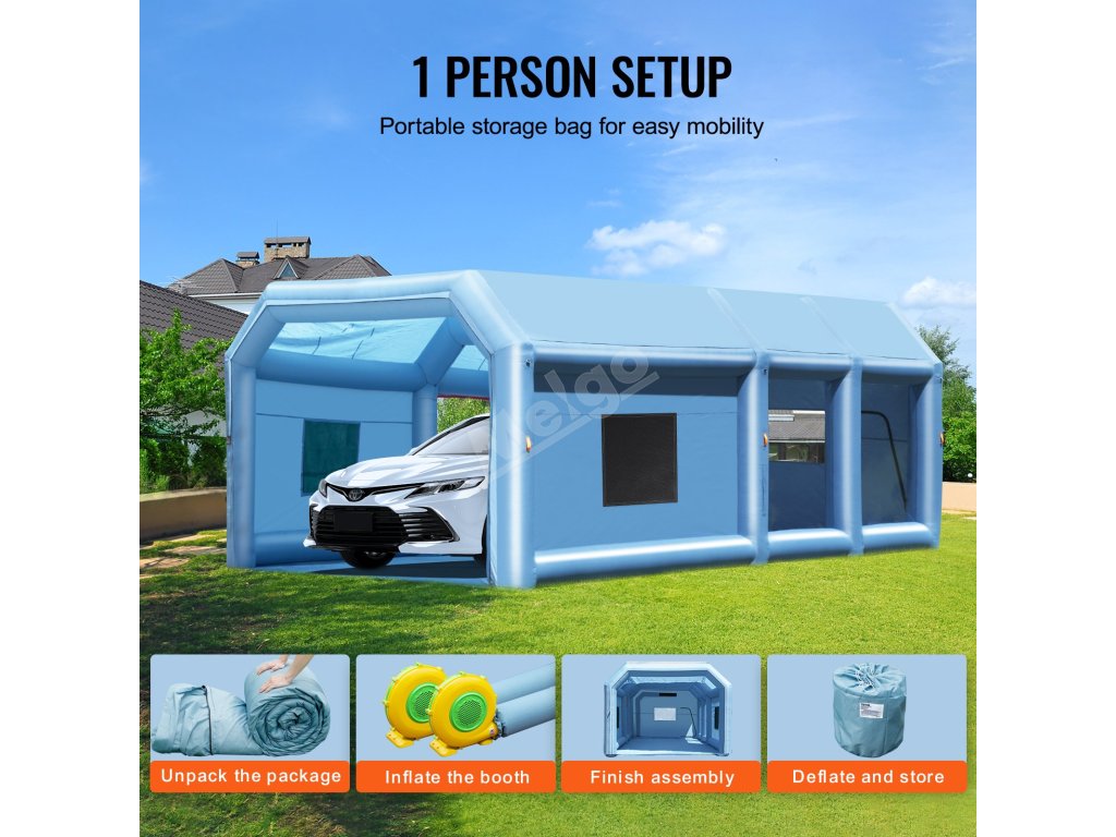 Přenosná nafukovací lakovací kabina se snadno skládá a ukládá do přiložené tašky pro bezproblémovou přepravu a mobilitu. Ať už pracujete venku nebo se přesouváte mezi jednotlivými místy, poskytuje bezkonkurenční pohodlí.