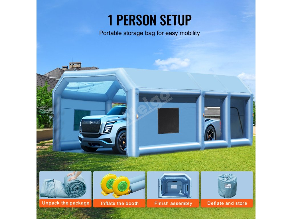 Přenosná nafukovací lakovací kabina se snadno skládá a ukládá do přiložené tašky pro bezproblémovou přepravu a mobilitu. Ať už pracujete venku nebo se přesouváte mezi jednotlivými místy, poskytuje bezkonkurenční pohodlí.
