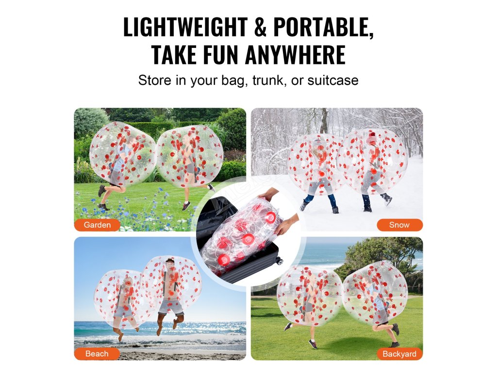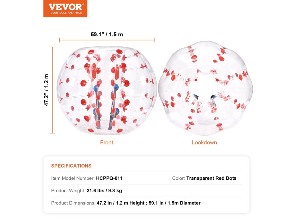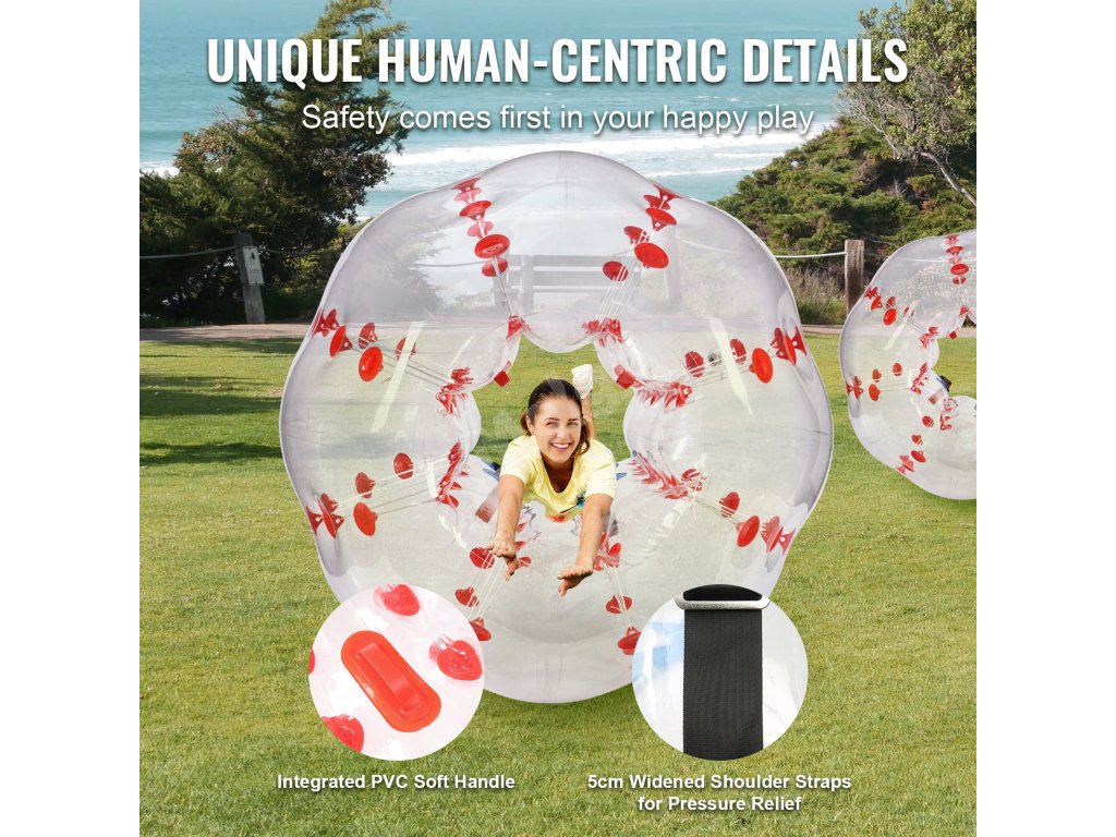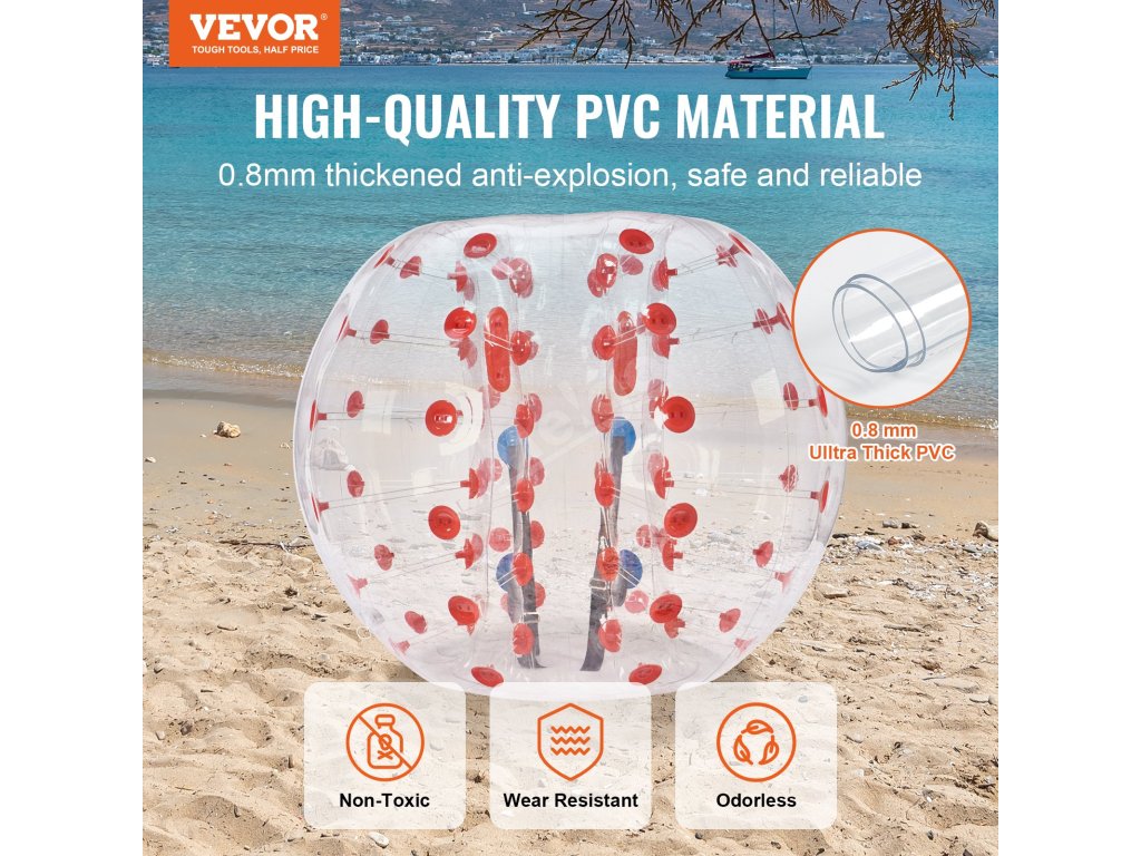 Rozpoutejte dokonalou zábavu s nafukovacími míči VEVOR. Naše nárazníkové míče o vnějším průměru 5 stop jsou vyrobeny z 0,8 mm silného PVC odolného proti výbuchu a jsou navrženy pro maximální odolnost a bezpečnost. Připravte se na nárazové vzrušení a vytvořte nezapomenutelné okamžiky s bublinkovými míči VEVOR!