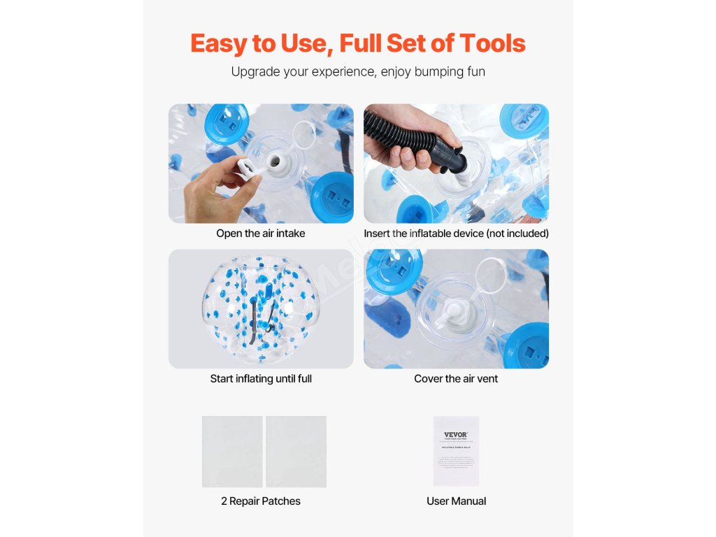 Každá sada se snadno používá, obsahuje podrobný návod k použití a 2 opravné záplaty. Postup je snadný: stačí výrobek rozložit, odšroubovat velký nafukovací ventil, nafouknout jej vzduchovou pumpou (není součástí balení) a po úplném nafouknutí rychle utáhnout ventil a začít hrát.