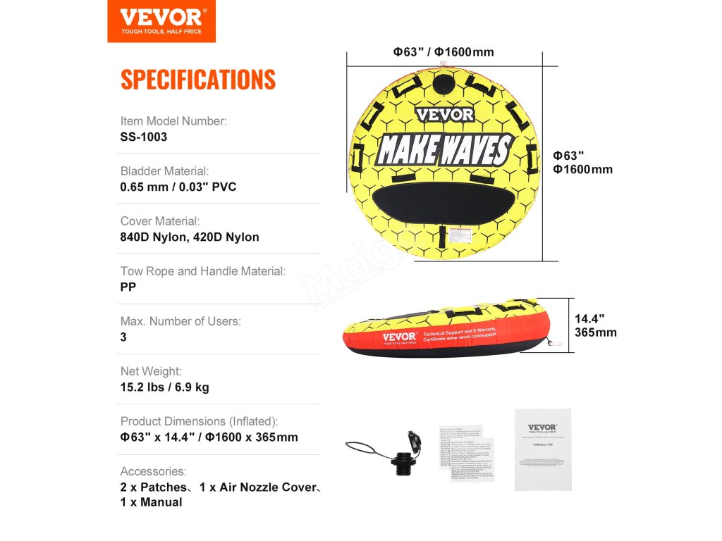 | Rozměry výrobku (nafouknuté) | Φ63,0" x 14,4" / Φ1600 x 365 mm |