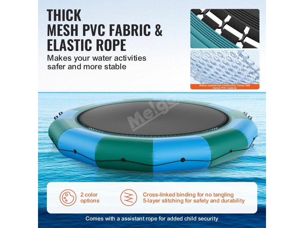 Vyrobeno ze silné PVC tkaniny, nepromokavé, odolné proti opotřebení a trvanlivé. Bungee šňůry mají pět vrstev prošití a jsou bezpečně propletené, což zajišťuje bezpečnost a zabraňuje zamotání nohou. Pro zvýšení bezpečnosti jsou k dispozici pomocná lana, zejména pro použití dětmi.