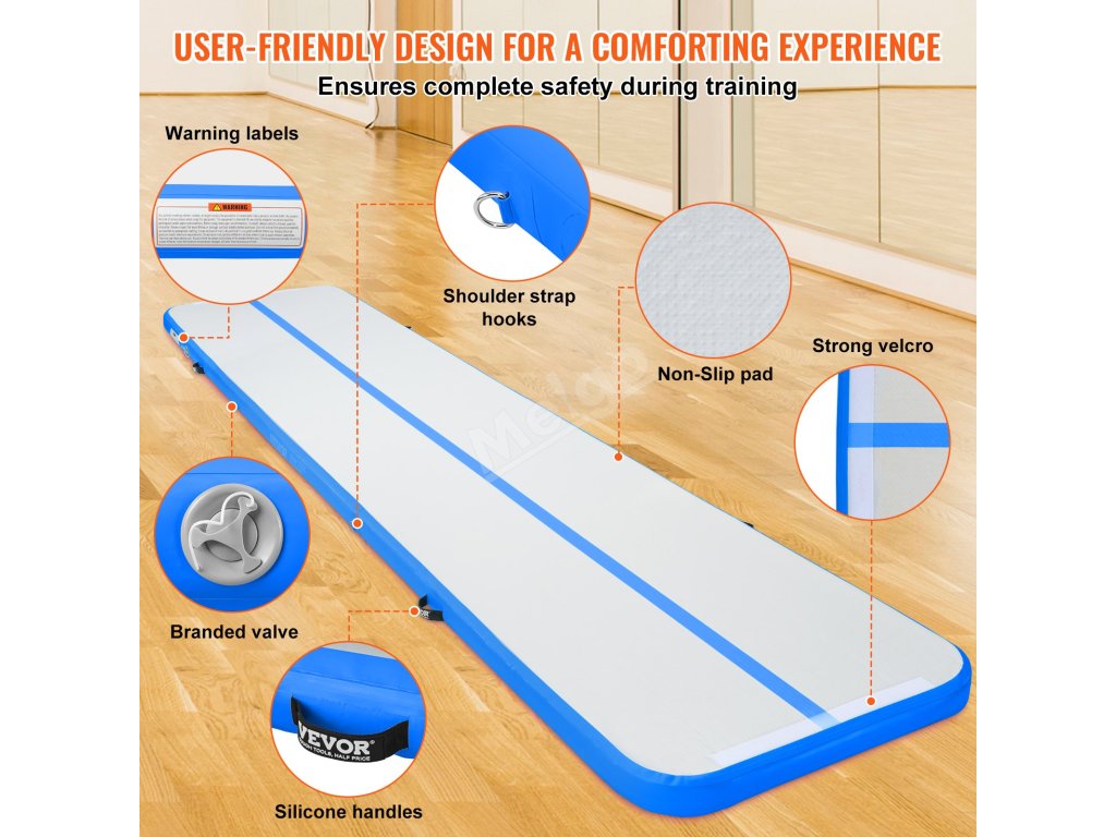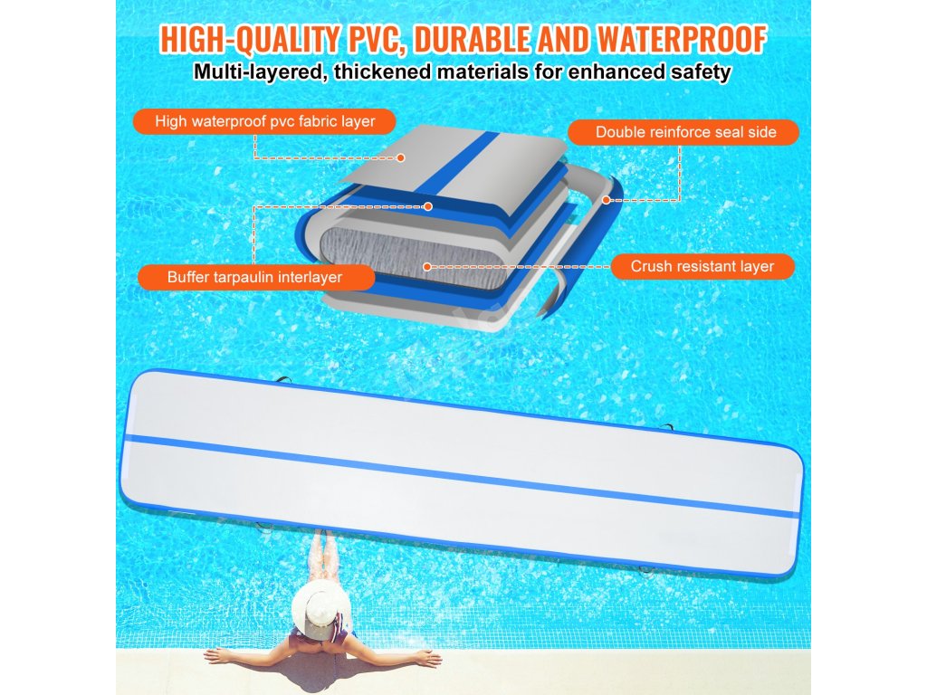 Tato nafukovací gymnastická podložka je měkká, vysoce elastická součást sportovního tréninkového vybavení vyrobená z PVC materiálu. Vyznačuje se voděodolnými, protiskluzovými a ekologickými vlastnostmi. Její vysoká elasticita zajišťuje ochranu před zraněním během cvičení.