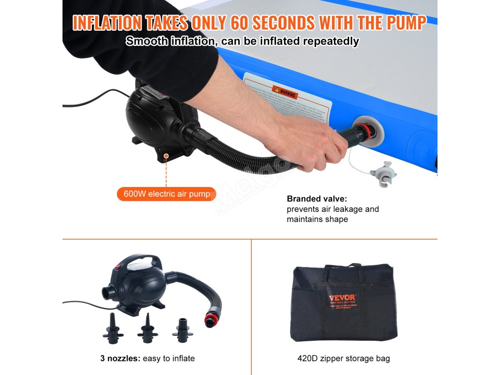 Tréninková podložka je dodávána s elektrickým čerpadlem o výkonu 600 W. Nafouknutí nebo vyfouknutí trvá méně než minutu a vydrží vzduchotěsná několik dní. Dodává se se značkovým dveřním ventilem pro zaručenou kvalitu, je vybavena několika tryskami a hadicemi pro snadné použití. Pouzdro na zip pro pohodlné skladování.