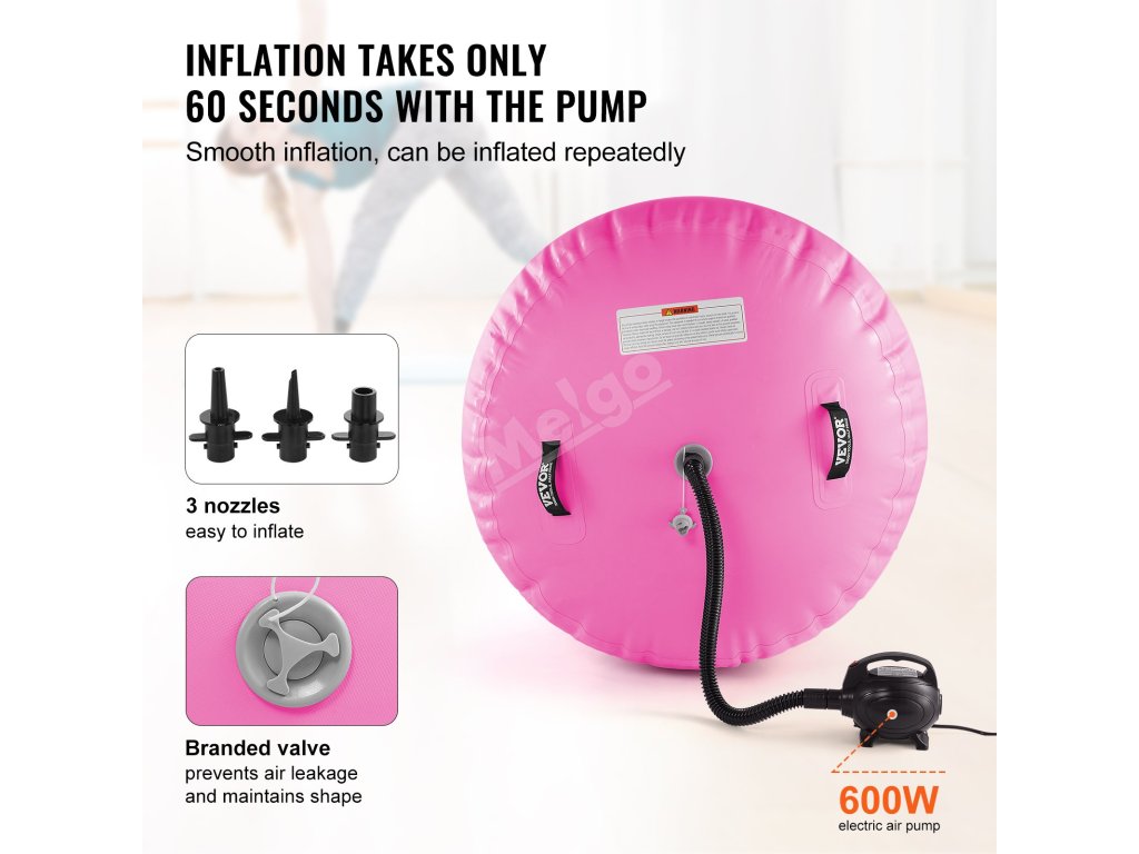 Tréninková podložka je dodávána s elektrickým čerpadlem o výkonu 600 W. Nafouknutí nebo vyfouknutí trvá méně než minutu a vydrží vzduchotěsná několik dní. Dodává se se značkovým dveřním ventilem pro spolehlivou kvalitu, několika tryskami a hadicemi pro snadné použití. úložné pouzdro se šňůrkou 210D pro snadné skladování.