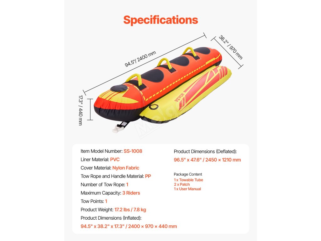 | Rozmery výrobku (nafúknutý) | 94.5" x 38,2" x 17,3" / 2400 x 970 x 440 mm |