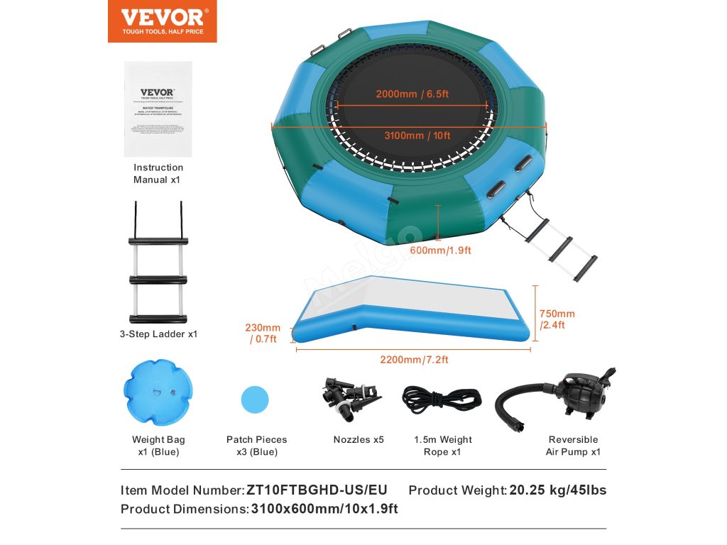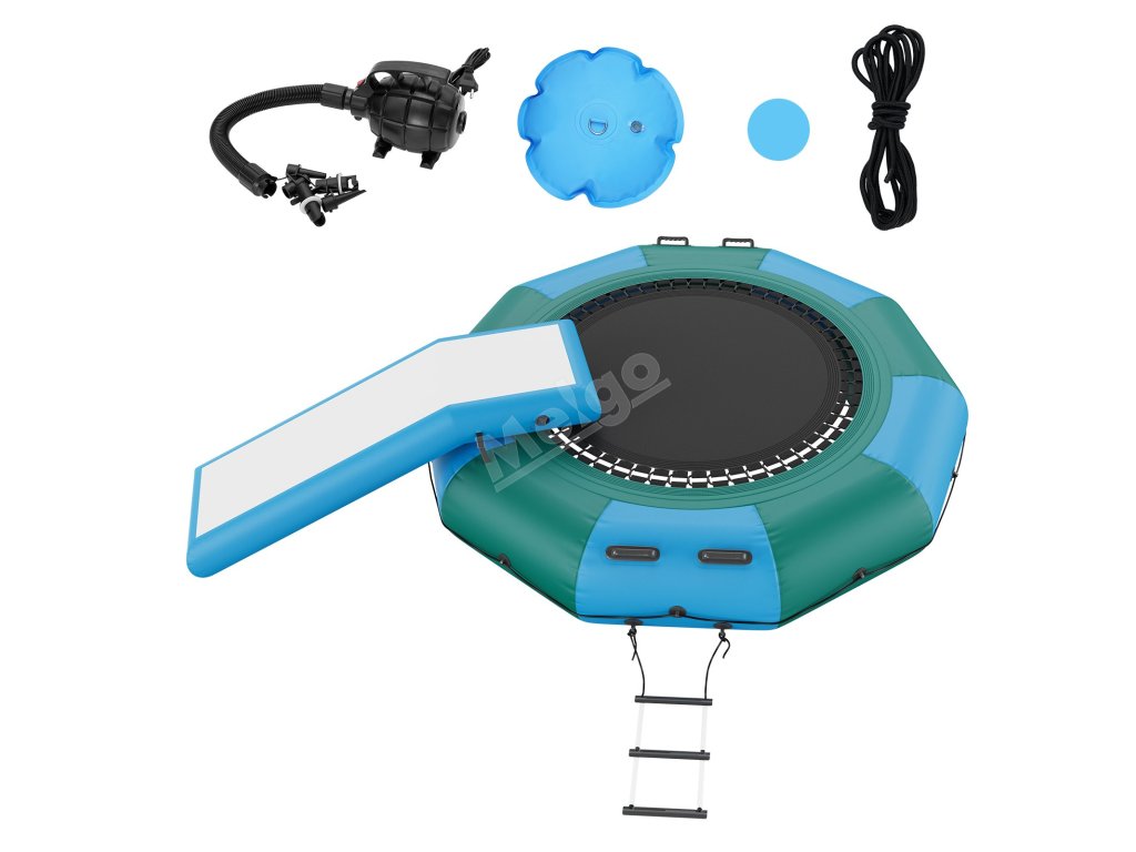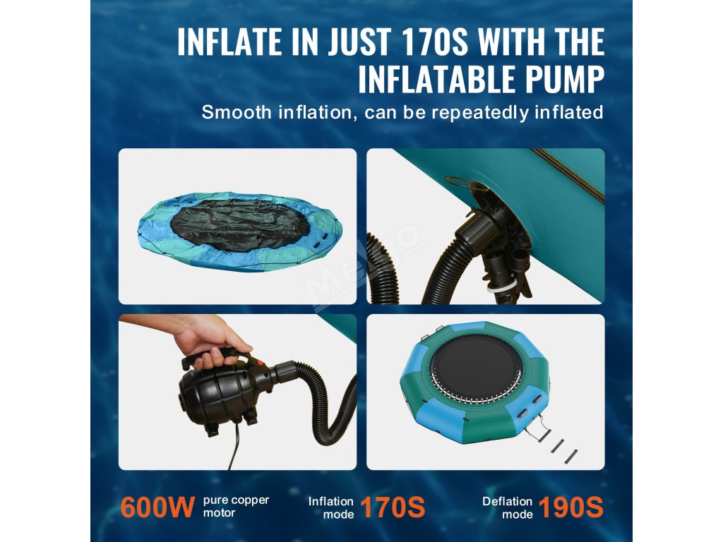 Je vybaven 600wattovou pumpou s čistě měděným motorem, která zajišťuje nepřetržitý proces nafukování. Montáž a demontáž této plovoucí trampolíny vyžaduje minimum času. Po vyfouknutí se stává kompaktní a lehkou, což usnadňuje její přepravu z jednoho místa na druhé.