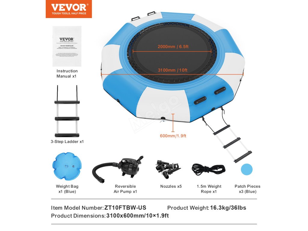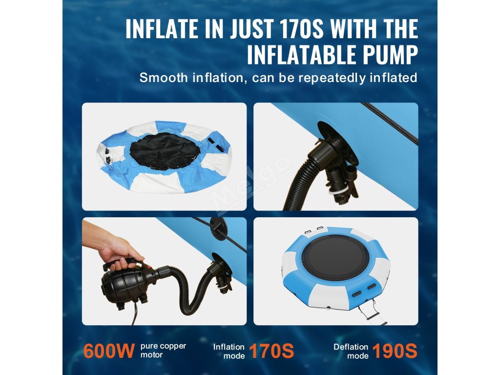 Je vybaven 600wattovou pumpou s čistě měděným motorem, která zajišťuje nepřetržitý proces nafukování. Montáž a demontáž této plovoucí trampolíny vyžaduje minimum času. Po vyfouknutí se stává kompaktní a lehkou, což usnadňuje její přepravu z jednoho místa na druhé.
