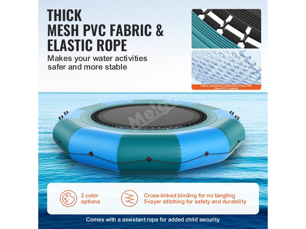 Vyrobeno ze silné PVC tkaniny, nepromokavé, odolné proti opotřebení a trvanlivé. Bungee šňůry mají pět vrstev prošití a jsou bezpečně propletené, což zajišťuje bezpečnost a zabraňuje zamotání nohou. Pro zvýšení bezpečnosti jsou k dispozici pomocná lana, zejména pro použití dětmi.