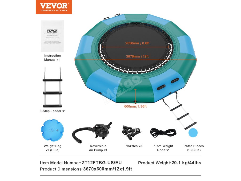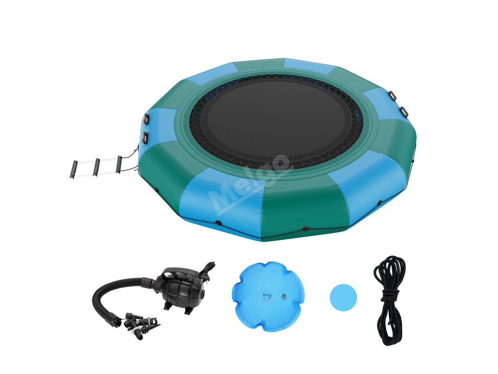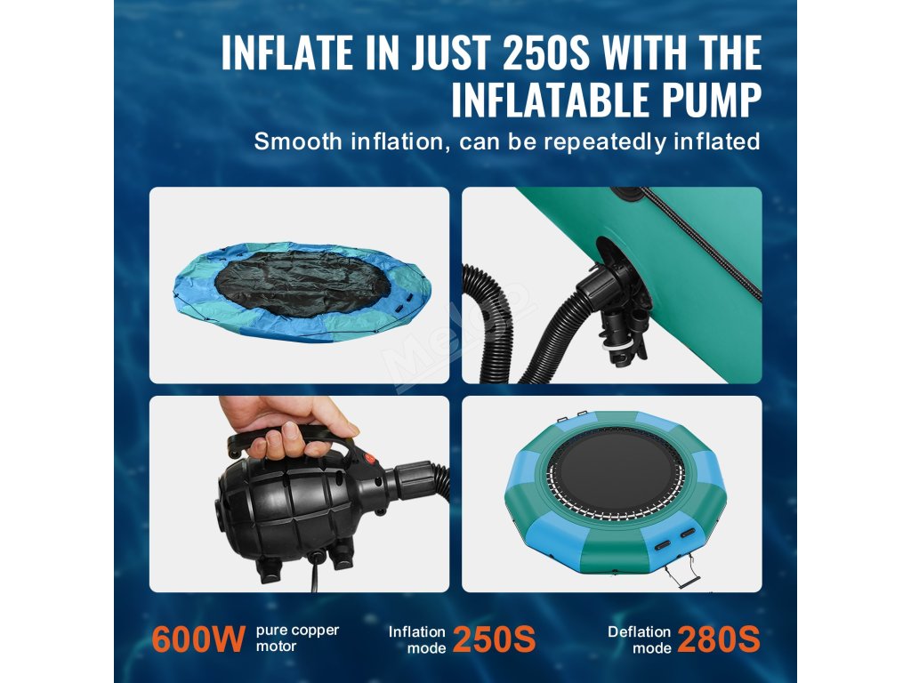 Je vybaven 600wattovou pumpou s čistě měděným motorem, která zajišťuje nepřetržitý proces nafukování. Montáž a demontáž této plovoucí trampolíny vyžaduje minimum času. Po vyfouknutí se stává kompaktní a lehkou, což usnadňuje její přepravu z jednoho místa na druhé.