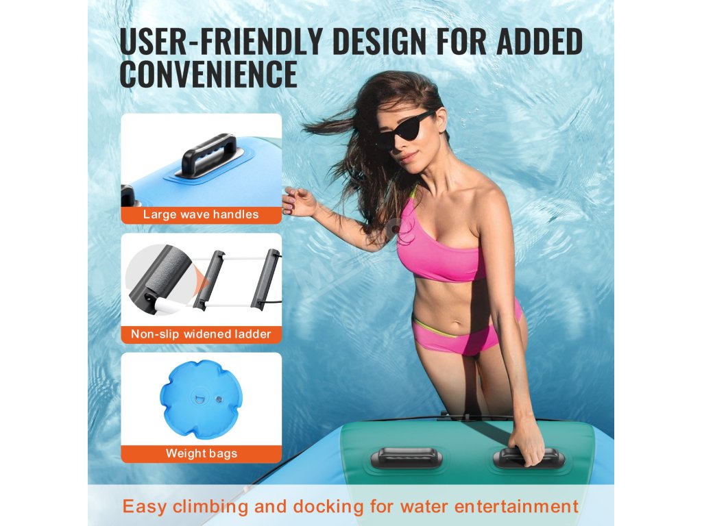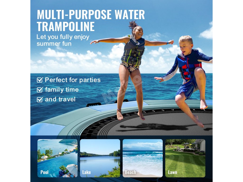 Nafukovací vodní trampolína má široké využití a lze ji použít jako plošinu pro plavání, rybaření nebo opalování. Dávejte jen pozor, abyste se vyhnuli ostrým předmětům.
