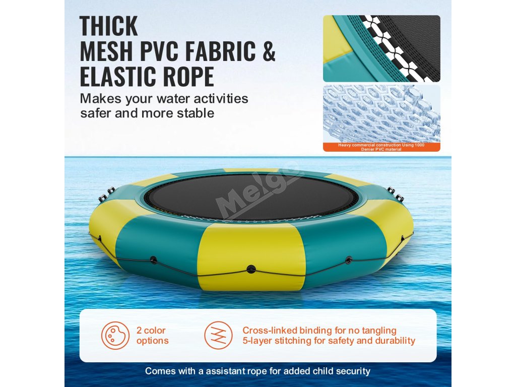 Vyrobeno ze silné PVC tkaniny, nepromokavé, odolné proti opotřebení a trvanlivé. Bungee šňůry mají pět vrstev prošití a jsou bezpečně propletené, což zajišťuje bezpečnost a zabraňuje zamotání nohou. Pro zvýšení bezpečnosti jsou k dispozici pomocná lana, zejména pro použití dětmi.
