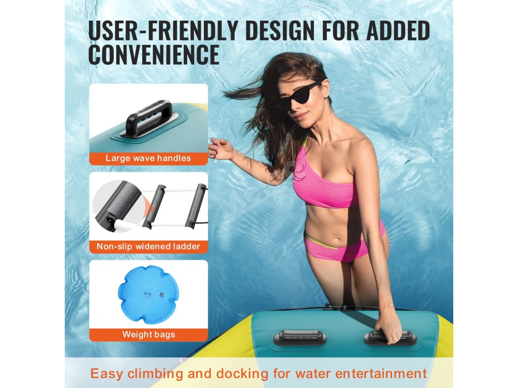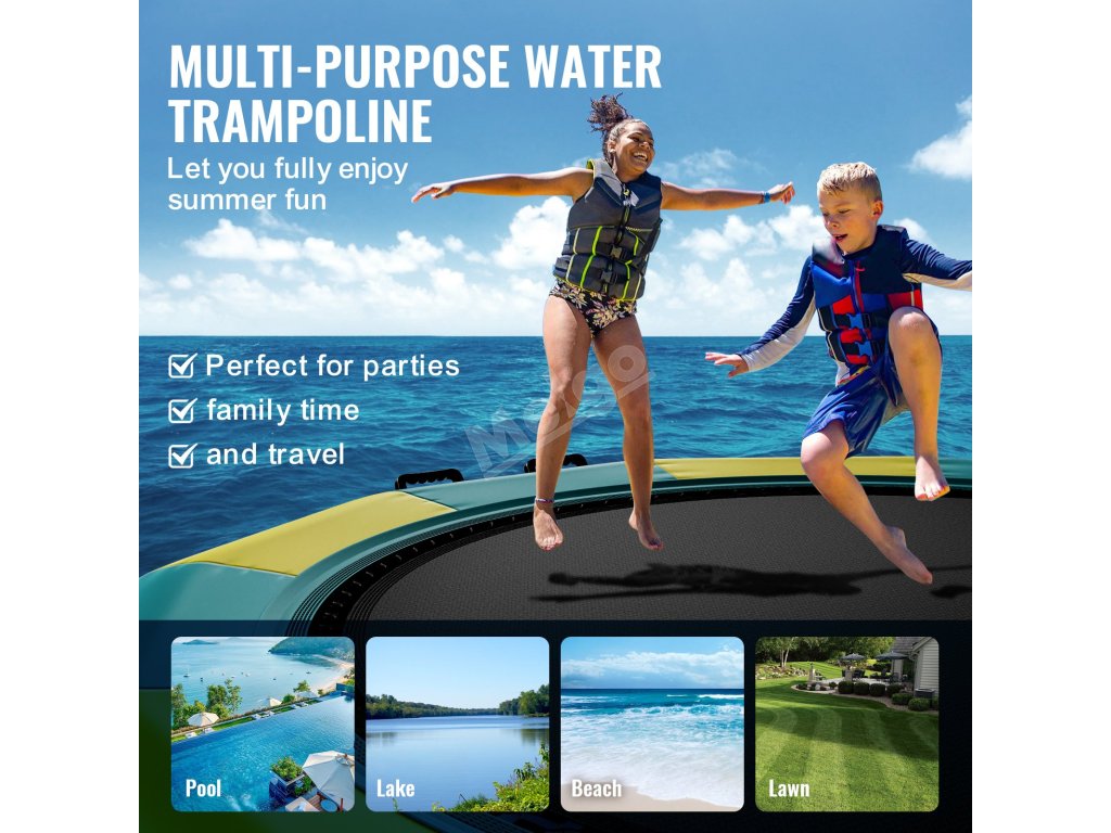 Nafukovací vodní trampolína má široké využití a lze ji použít jako plošinu pro plavání, rybaření nebo opalování. Dávejte jen pozor, abyste se vyhnuli ostrým předmětům.