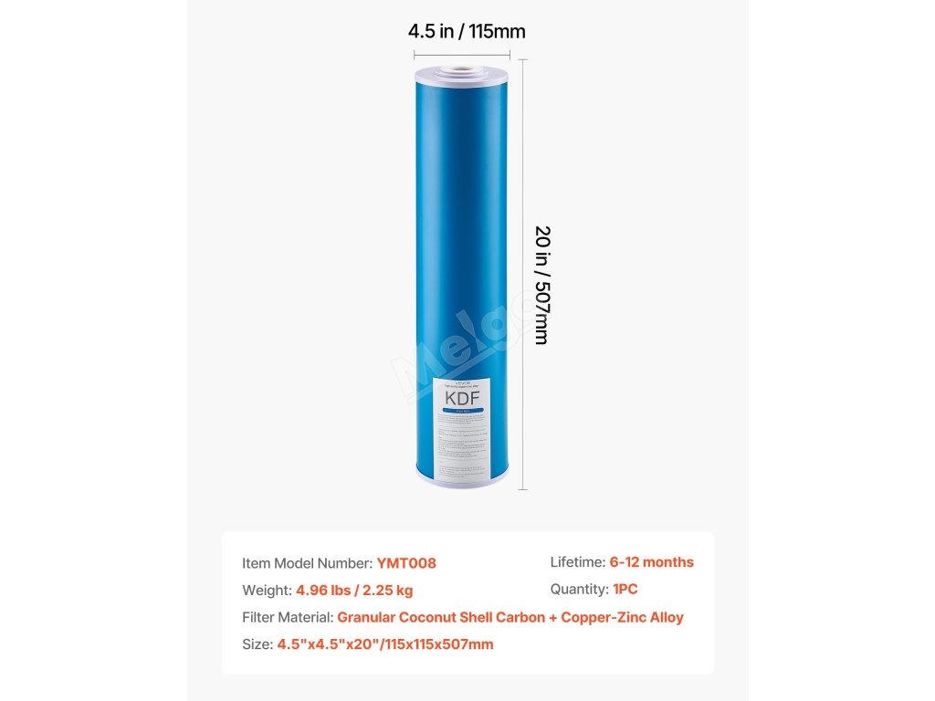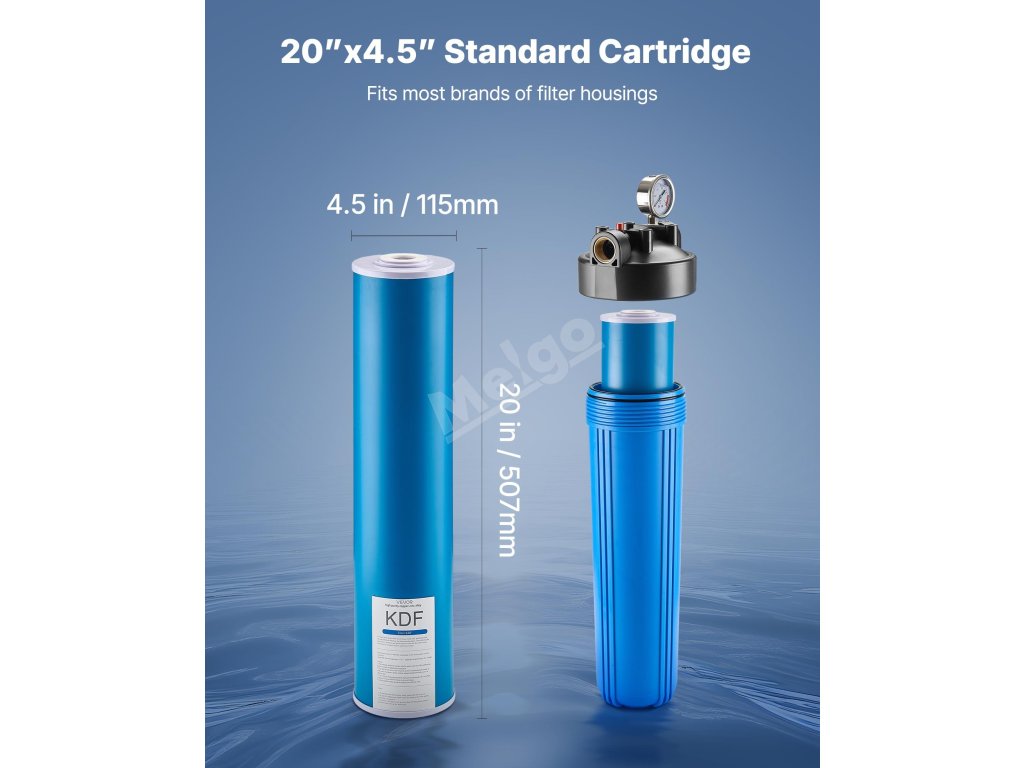 Náhradní kazeta má standardní velikost 4,5" x 20" s vysokou průtokovou kapacitou a je kompatibilní s většinou celoplošných filtračních skříní a systémů filtrace vody, takže její výměna je jednoduchá a bezproblémová.