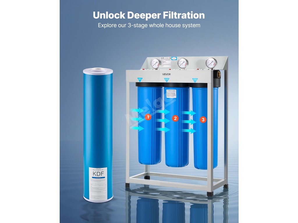 Náš třístupňový systém celoplošné filtrace vody využívá několik filtračních procesů k hloubkovému čištění vody z vodovodu a studny, odstraňuje nečistoty a kontaminanty a zajišťuje tak čistou vodu v celém domě.