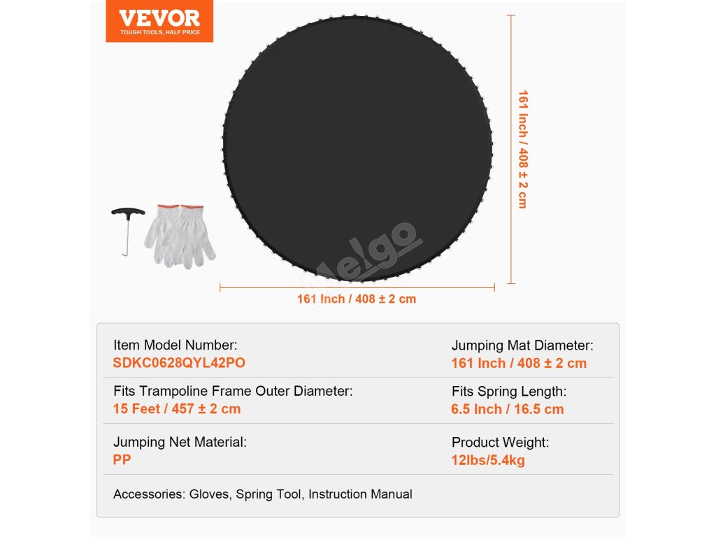 Vhodné pro 15stopé kruhové trampolíny s 96 V-kroužky, s použitím 6,5palcových pružin a průměrem podložky 161 palců. Poznámka: Rám a pružiny nejsou součástí dodávky.