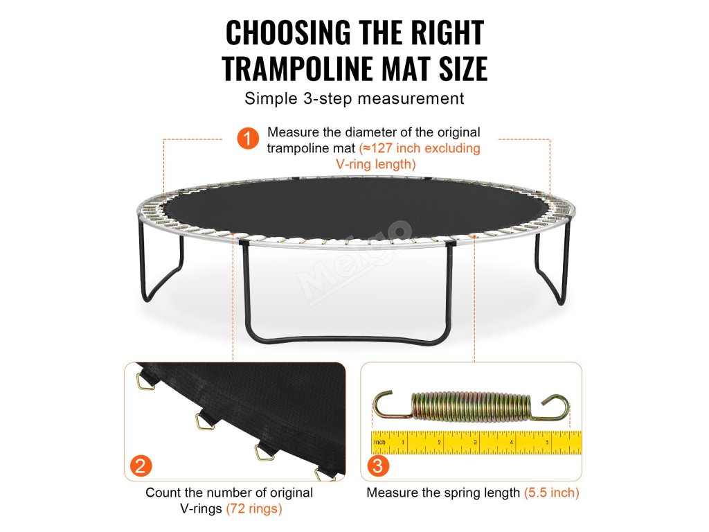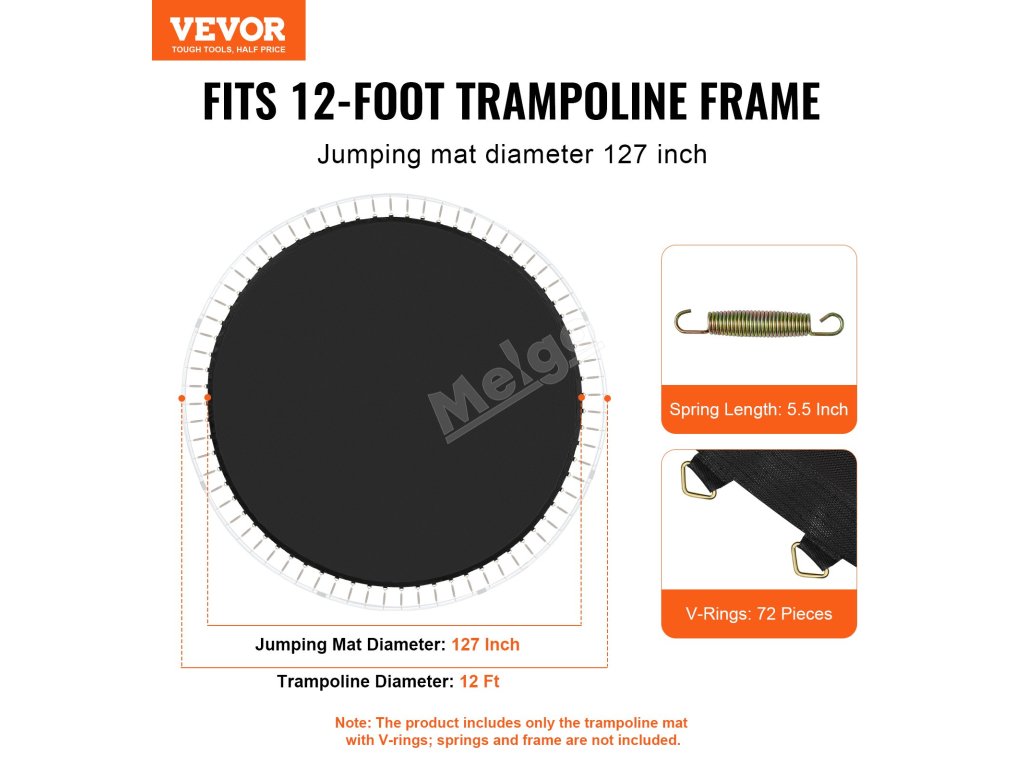 Vhodné pro 12stopé kruhové trampolíny se 72 V-kroužky, s 5,5palcovými pružinami a průměrem podložky 127 palců. Poznámka: Rám a pružiny nejsou součástí dodávky.
