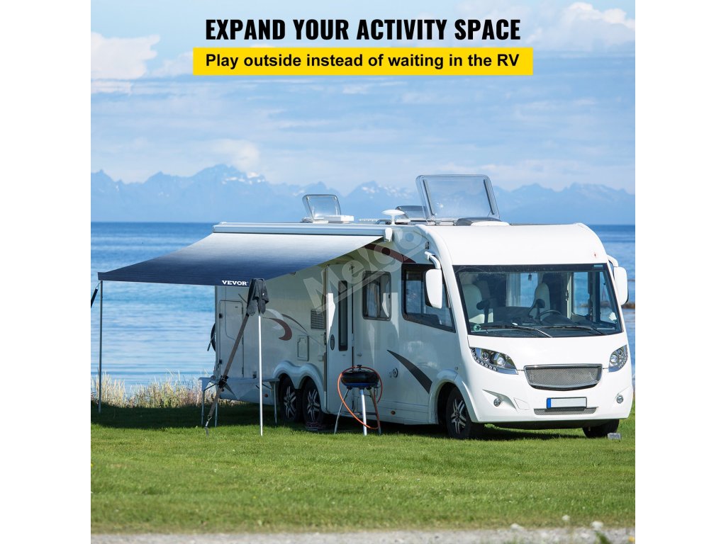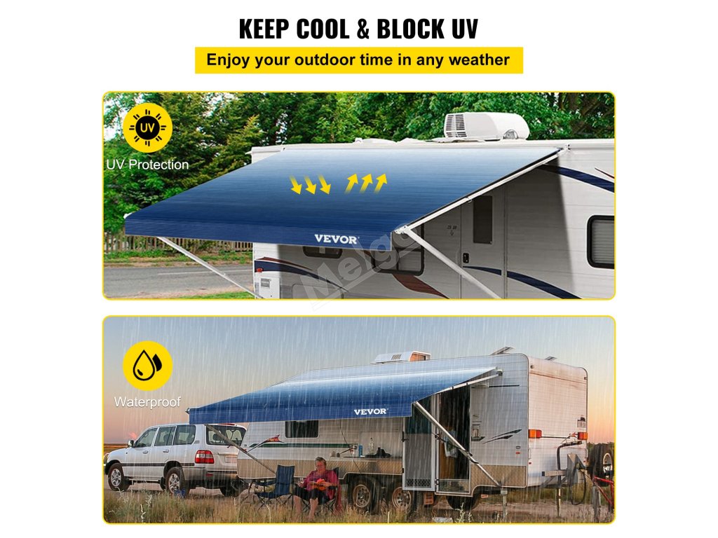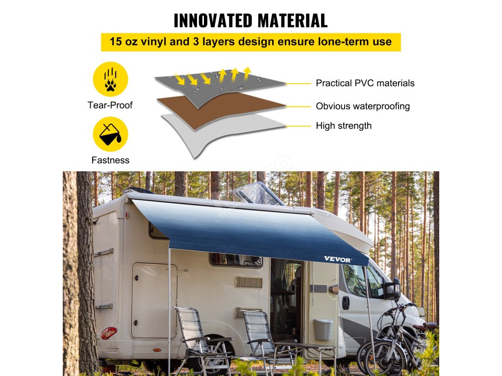 Náhradní látka pro markýzu pro obytné vozy má rozměry 17,2 ft x 8 ft/524 x 240 cm a poskytuje dostatek stínu. Má velmi dlouhou životnost a doplní každé obytné vozidlo.