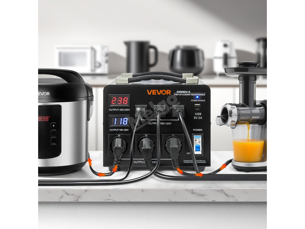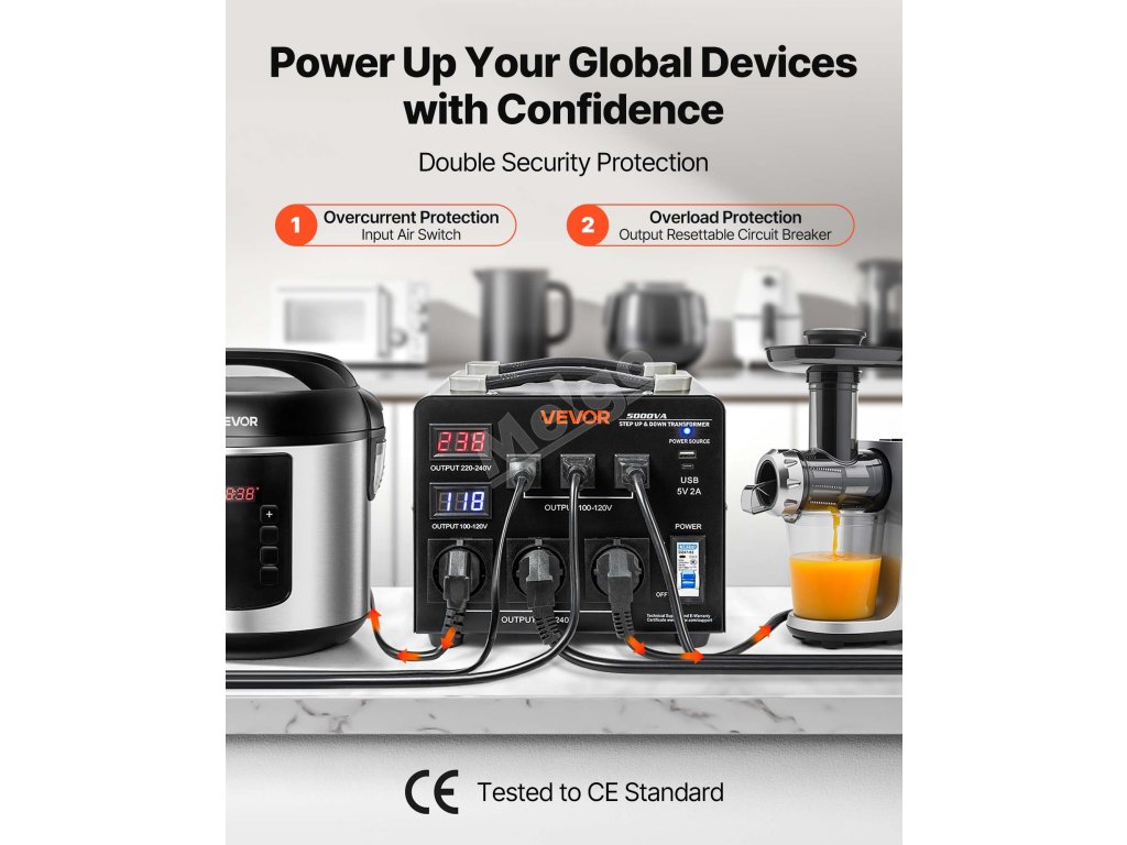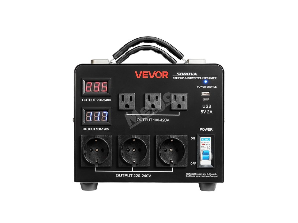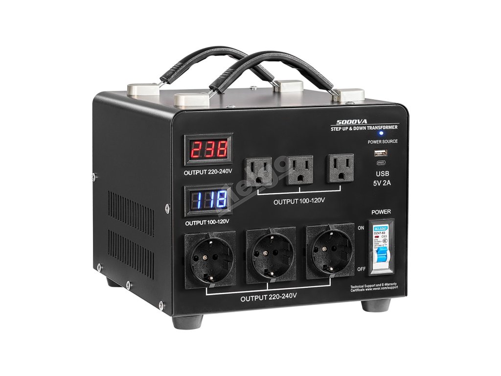 Napěťový transformátor 5000VA, 110/220V, 3×US/3×EU zásuvky, LCD, jistič