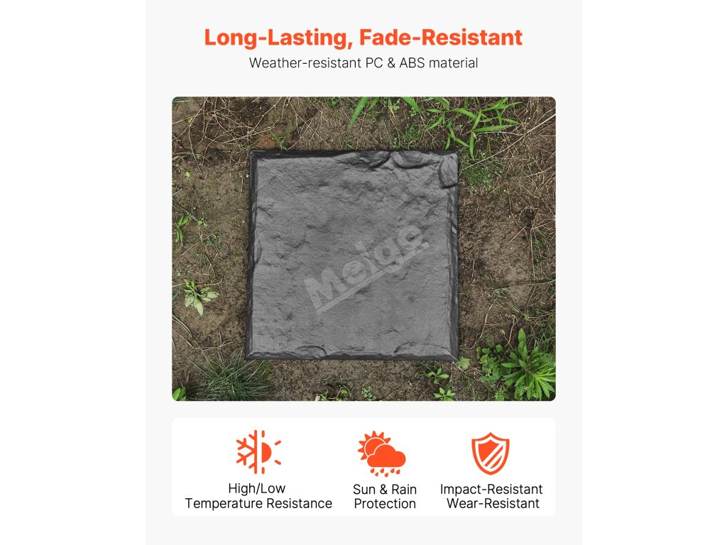 Tieto 4 ks záhradných nášľapných kameňov sú vyrobené z PC a ABS živice odolnej voči poveternostným vplyvom a odolávajú slnku, dažďu a mrazu bez deformácie alebo vyblednutia. Každý nášľapný kameň obsahuje 4 kolíky do zeme a zosilnenú základňu pre väčšiu stabilitu - ideálne pre domácnosti s deťmi a domácimi zvieratami.