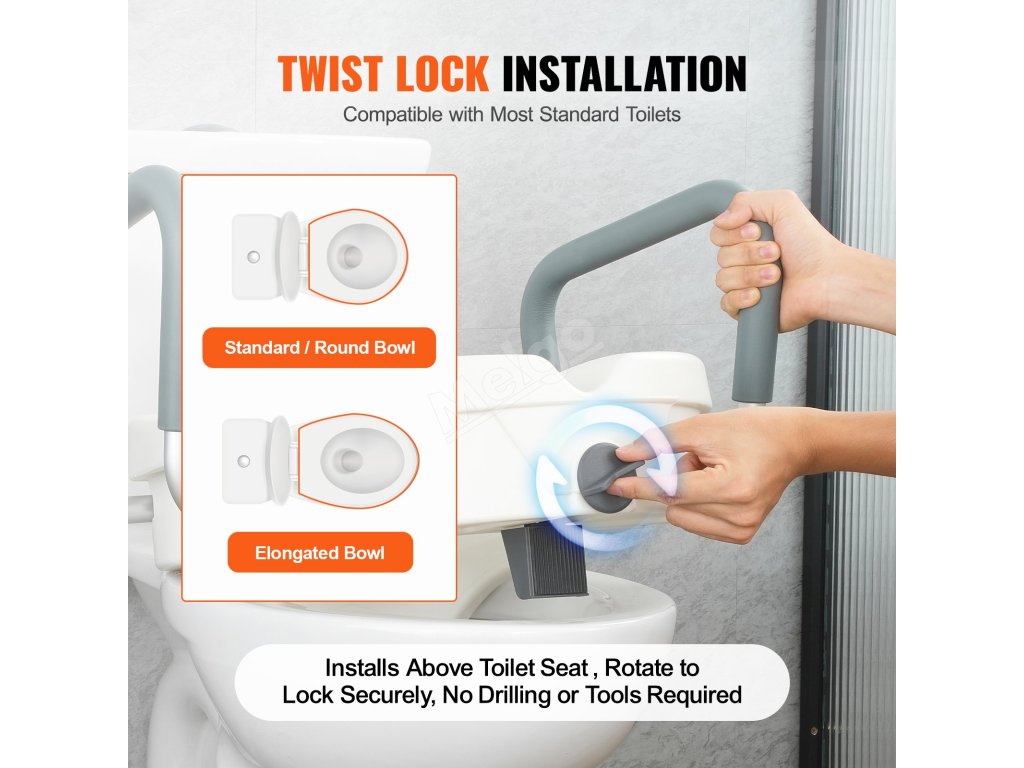 Toto sedátko je třeba instalovat nad záchodovou mísu, má minimální požadavky na tvar toalety a je vhodné pro většinu standardních kulatých a podlouhlých toalet.