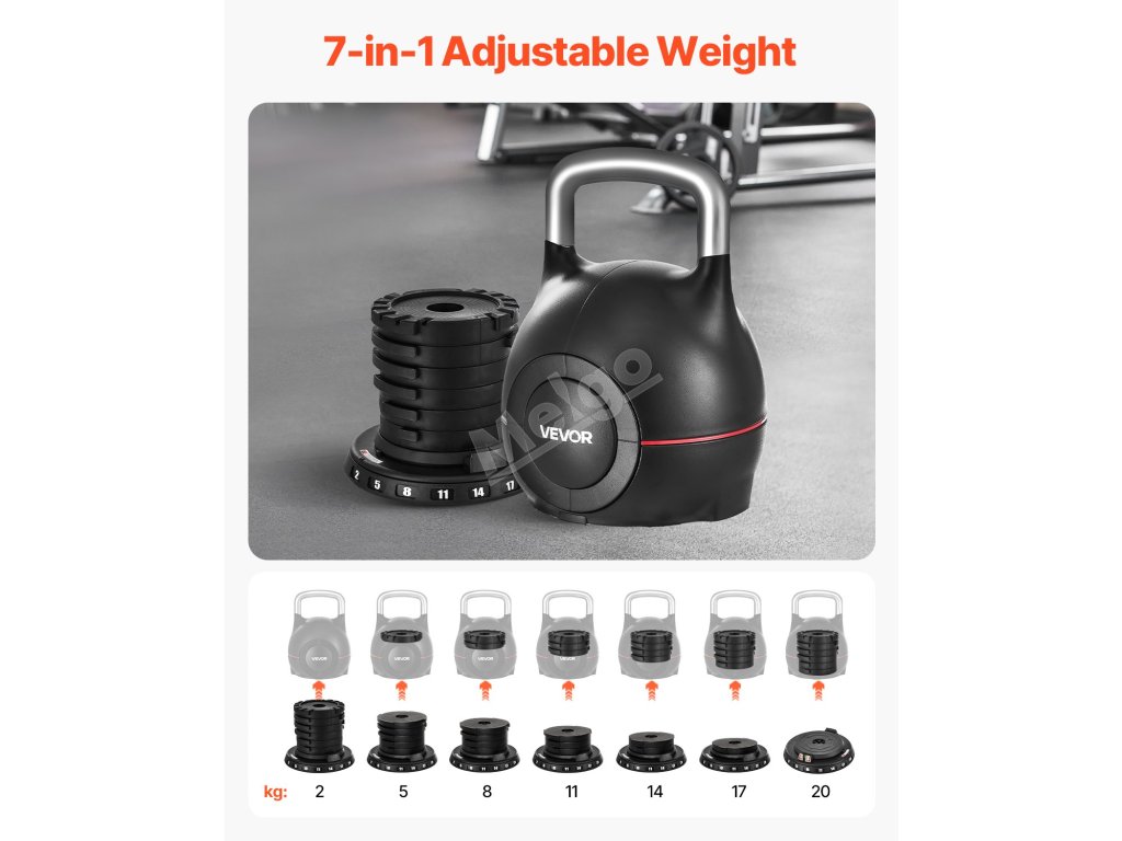 Nastavitelná kettlebell 7 stupňů 2,5-20 kg, hliník a ABS, pro trénink