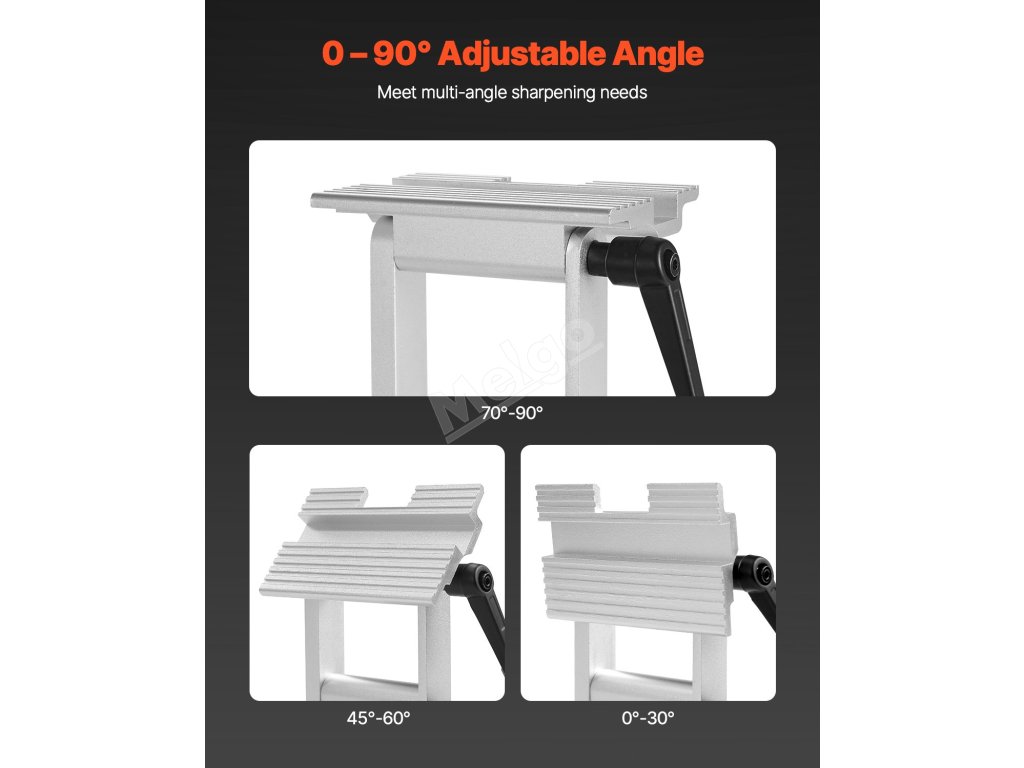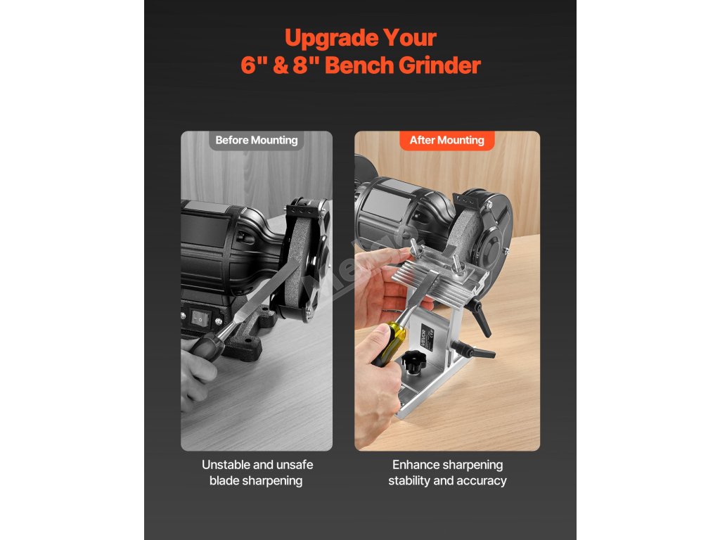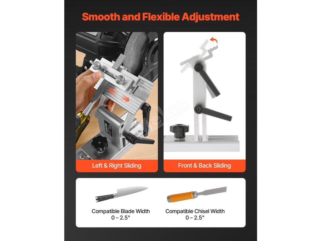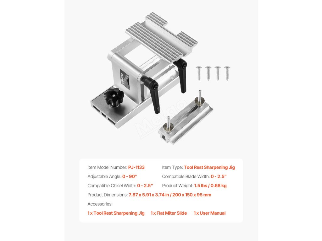 Pomocí našeho brousku na nože můžete přesně nabrousit čepele. Je kompatibilní s většinou stolních brusek o průměru 6" (152 mm) a 8" (203 mm), pojme čepele a dláta až do šířky 2,5 palce (64 mm), má posuv vpřed/vzad, nastavitelnou výšku a úhel 0-90°.