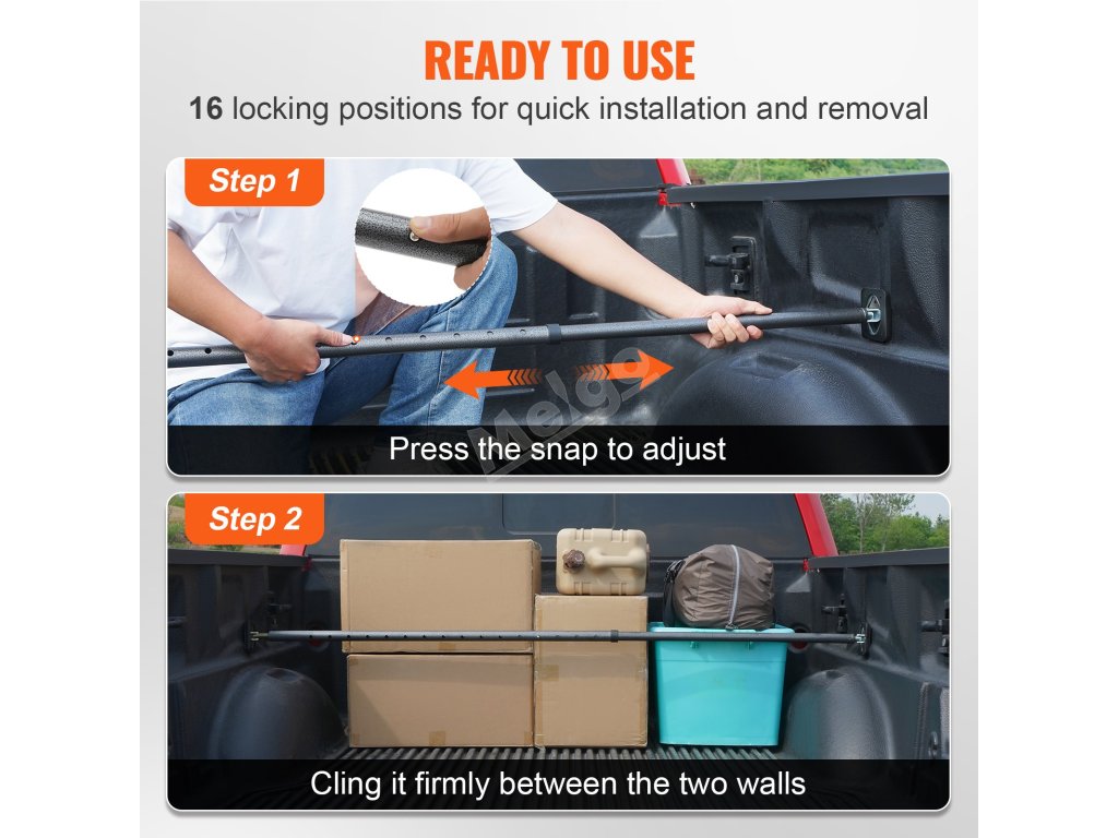 Nastavení délky a instalace nákladové tyče je snadná a zabere jen 10 sekund! Pro vyztužení není nutné vrtání ani žádné další nářadí. Díky 16 praktickým nastavovacím otvorům se pevně uzamkne na místě a zajistí bezpečné uchycení bez rizika uvolnění.