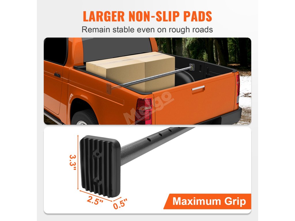 Naše nákladní tyč je na obou koncích vybavena pryžovými podložkami o rozměrech 2,5 × 3,3 palce a poskytuje výjimečnou protiskluzovost. Zůstane na svém místě, i když se setkáte s vodou nebo nárazy a vibracemi na hrbolaté silnici.