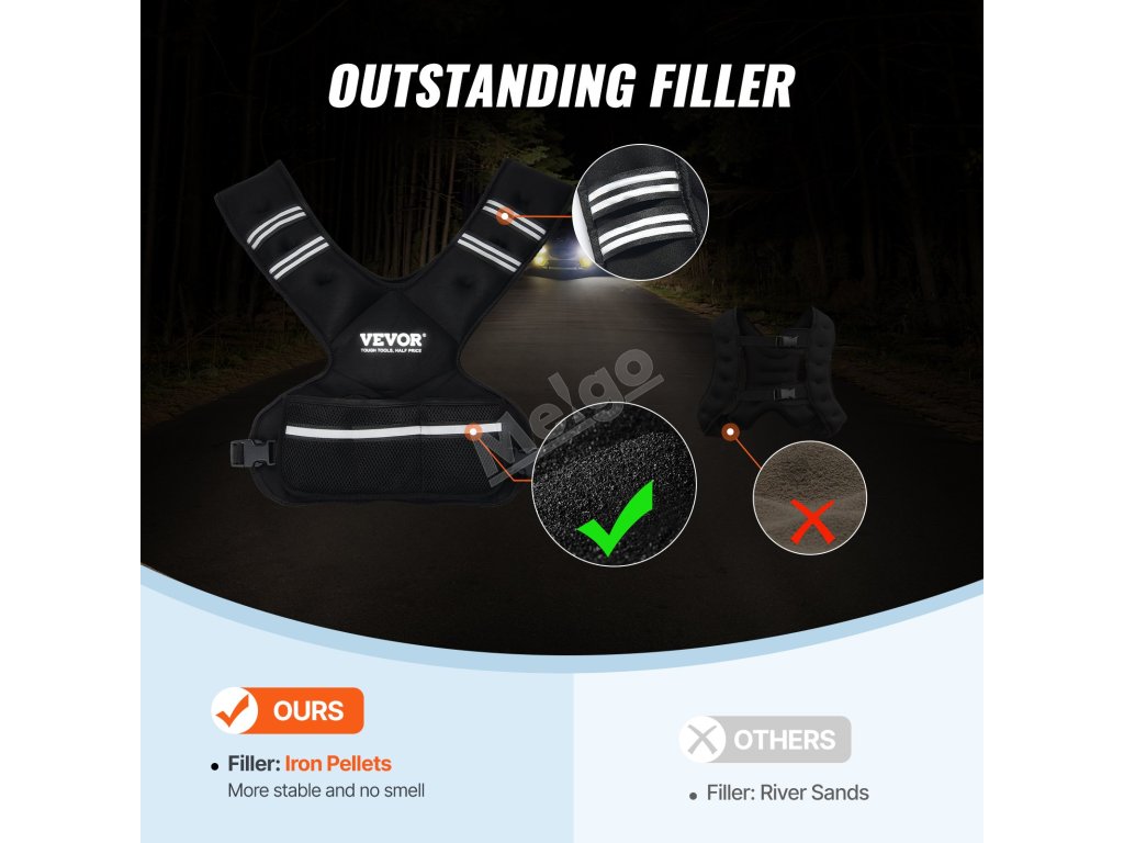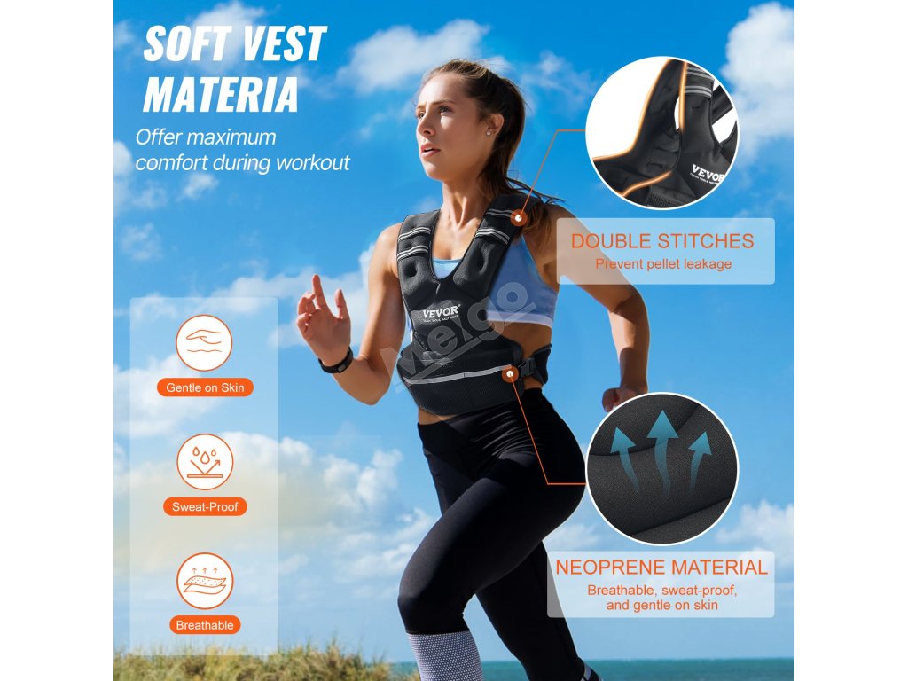 Tato nastavitelná zátěžová vesta je vyrobena z prvotřídního neoprenu, je prodyšná, odolná proti potu a šetrná k pokožce. Její dvojitě prošitá konstrukce zabraňuje úniku železných kuliček, zajišťuje stabilitu a žádný nepříjemný zápach během cvičení.