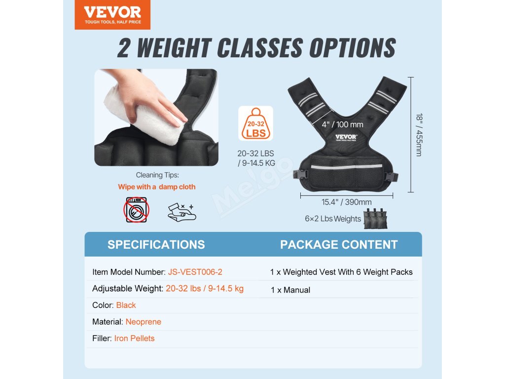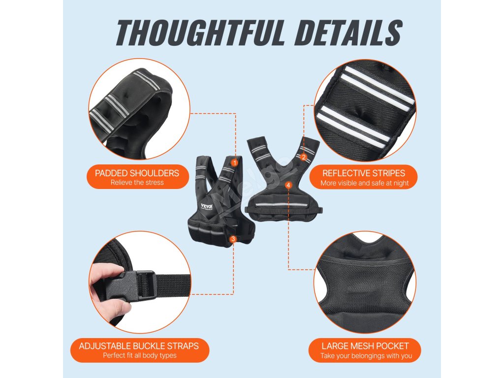 Základní vesta váží 20 kilogramů a pomocí šesti dvoukilogramových zátěžových sáčků s železnými peletami, které jsou součástí balení, ji lze upravit až na 32 kilogramů.