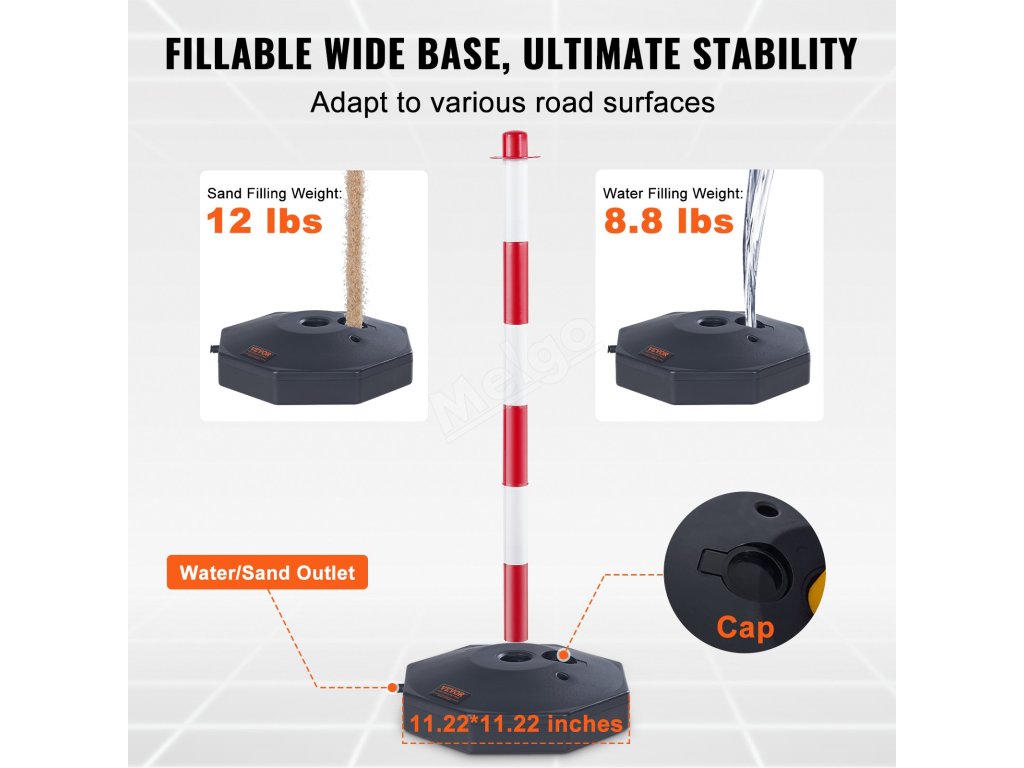 Naše sloupky pro vymezení provozu mají pevnou základnu o rozměrech 11,22 x 11,22 palce, která je navržena tak, aby byla stabilní a odolala zkoušce času. Hmotnost sloupků si můžete přizpůsobit díky možnosti naplnit je vodou (8,8 kg) nebo pískem (12 kg).
