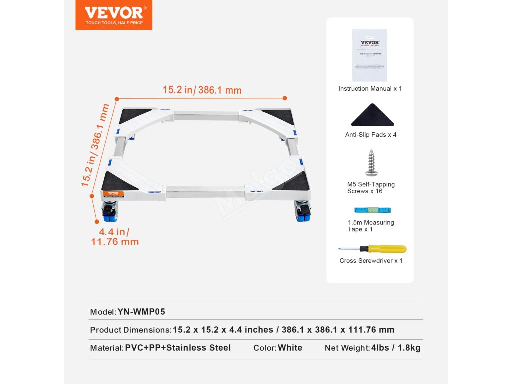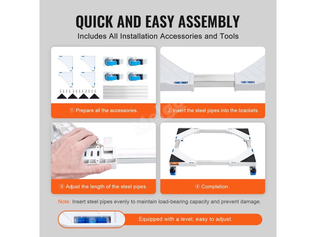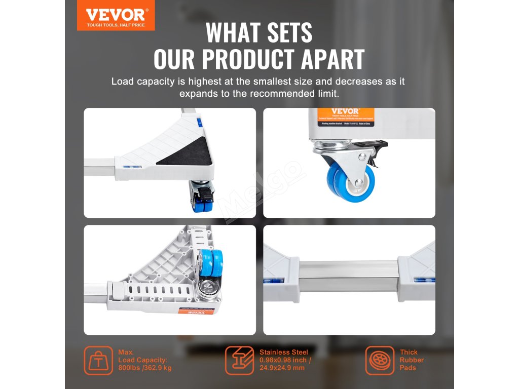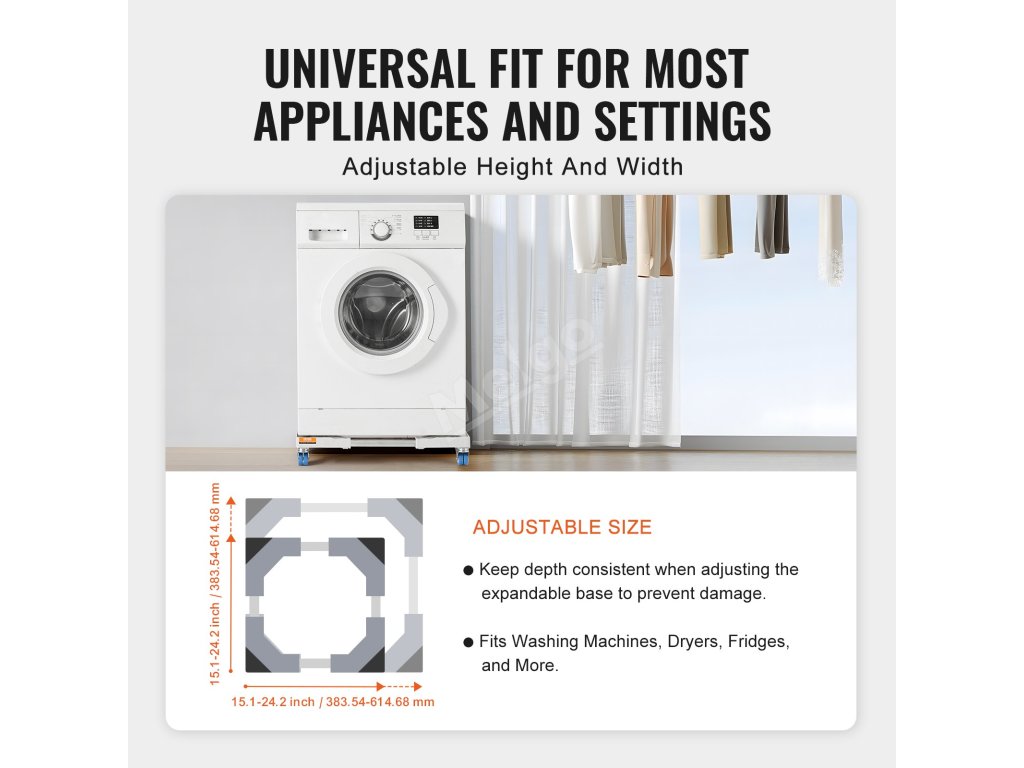Rozšiřitelná základna pračky se zesílenými trubkami z nerezové oceli unese minimální zatížení 800 liber (362,9 kg) při nejmenší velikosti a maximální zatížení 330 liber (149,7 kg). Ideální pro vyvýšení různých domácích spotřebičů.