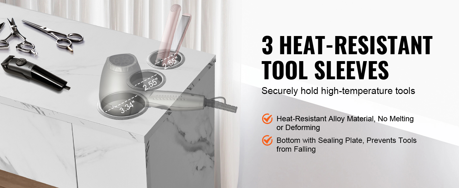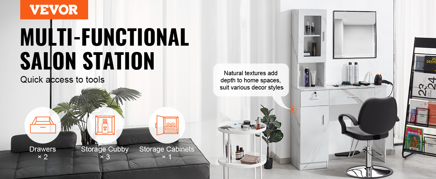 Naše kadeřnická stanice nabízí efektivní a pohodlný přístup k nástrojům díky 2 zásuvkám, 3 boxům a skříňce. Udržujte svůj pracovní prostor uklizený a organizovaný!