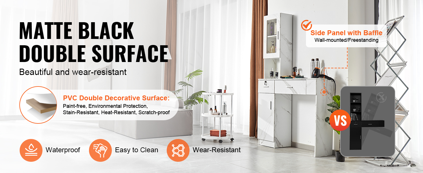 Naše kadeřnická stanice má elegantní a odolný povrch z PVC s dvojitým dekorem, doplněný bočními panely pro montáž na stěnu nebo volné postavení, který kombinuje estetiku s odolností.