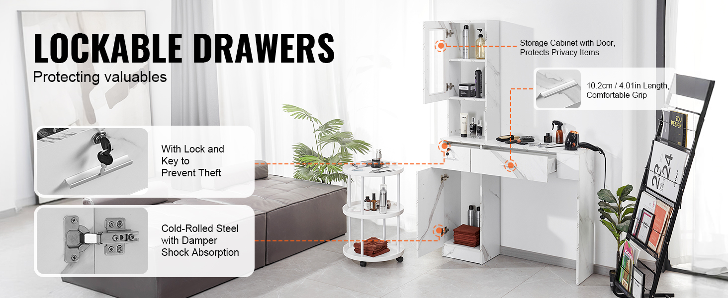 Je navržena s uzamykatelnými zásuvkami a klíči pro zabezpečení vašich cenností spolu s praktickými 10,2cm/4,01" úchyty z hliníkové slitiny a několika dvířky skříněk, které spolehlivě ochrání vaše soukromé věci.