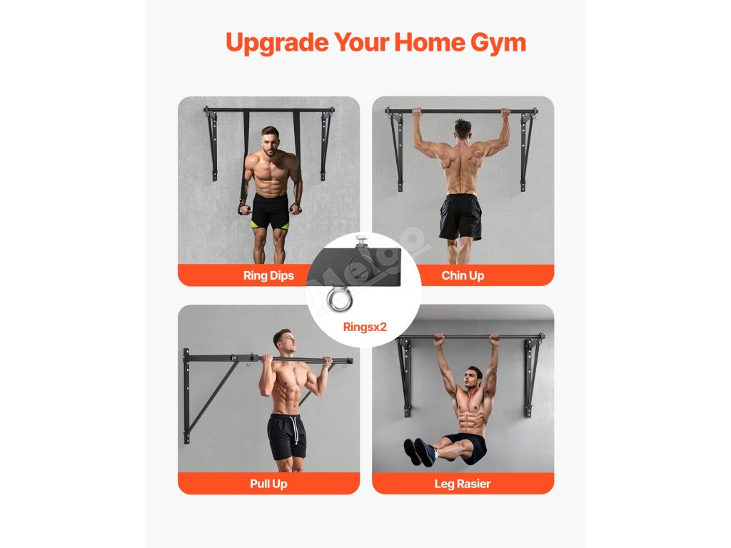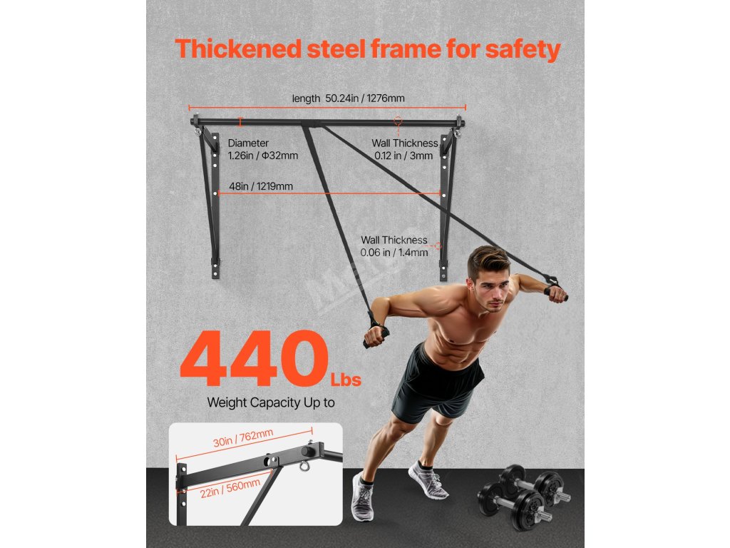 Tato domácí posilovací stanice s 30palcovou vzdáleností od stěny je kompatibilní s příslušenstvím, jako jsou břišní popruhy a gymnastické kruhy, a umožňuje provádět různé cviky, například přítahy, cvičení s odporovou gumou a kruhové cviky.
