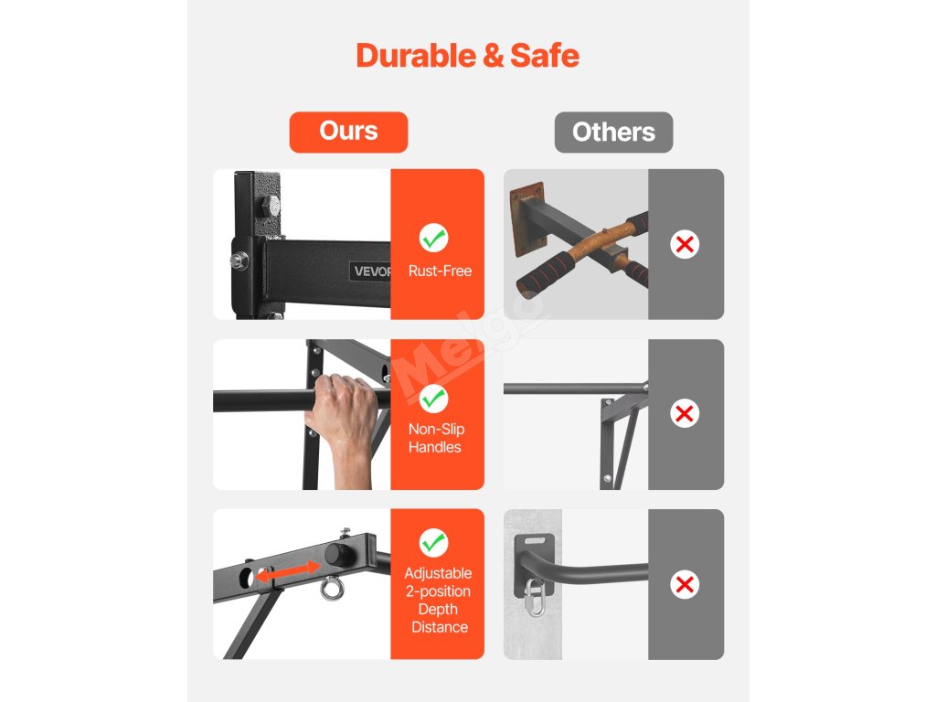 Hrazda pro přítahy horní části těla je vyrobena z odolné oceli a unese až 440 kg. S celkovou šířkou 50 palců a 1,25palcovými vroubkovanými rukojeťmi je to ideální posilovací tyč pro domácí použití. Je také vybavena dvěma nastavitelnými hloubkami (22/30 palců) pro flexibilní trénink.