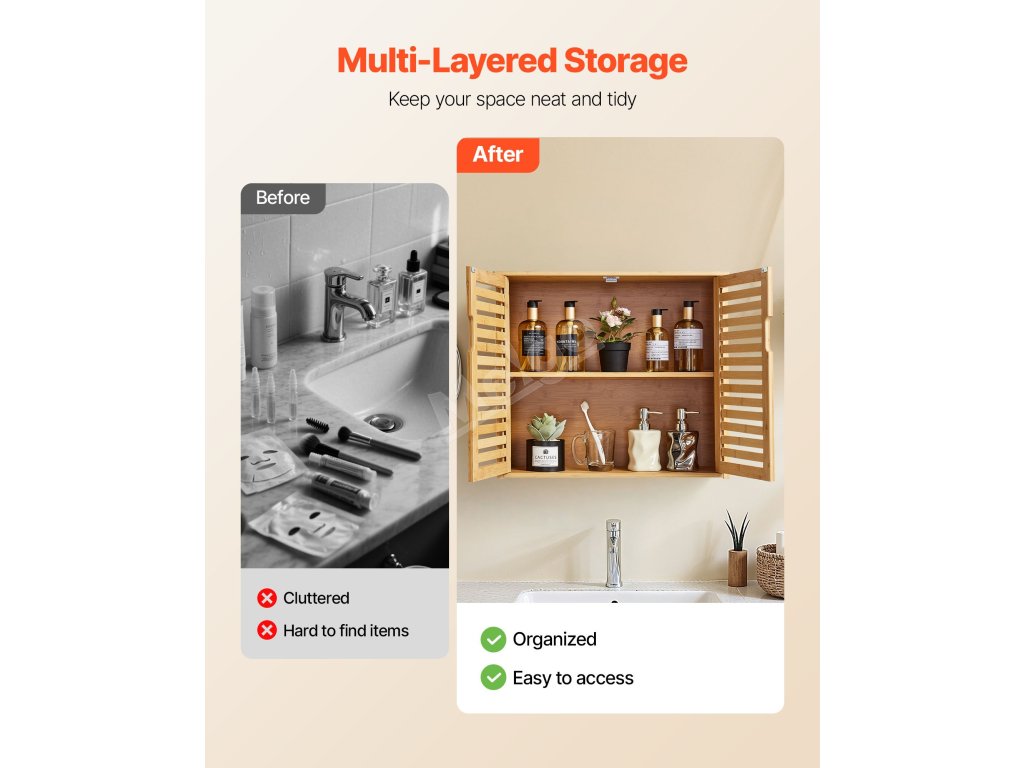 Tato multifunkční koupelnová nástěnná skříňka se snadno začlení do koupelen, kuchyní, ložnic, obývacích pokojů, chodeb a dalších obytných prostor. Flexibilně se přizpůsobí k ukládání toaletních potřeb, kuchyňských skříněk, uspořádání nepořádku v ložnici nebo k dekoraci stěn obývacího pokoje.