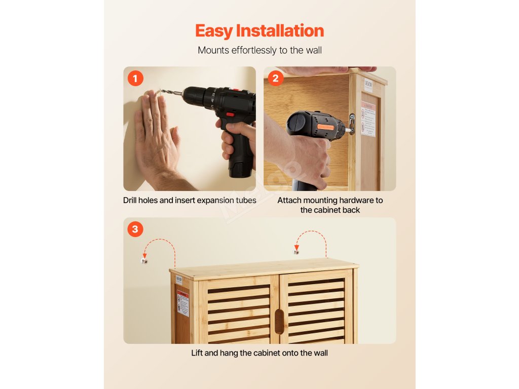 Tato nástěnná koupelnová skříňka má bezpečnou a stabilní montážní konstrukci, je dodávána s podrobným návodem k použití a kompletní sadou nářadí. Pro snadnou instalaci nejsou nutné žádné složité operace. Skříňku může na stěnu rychle namontovat jak začátečník, tak i neprofesionál.