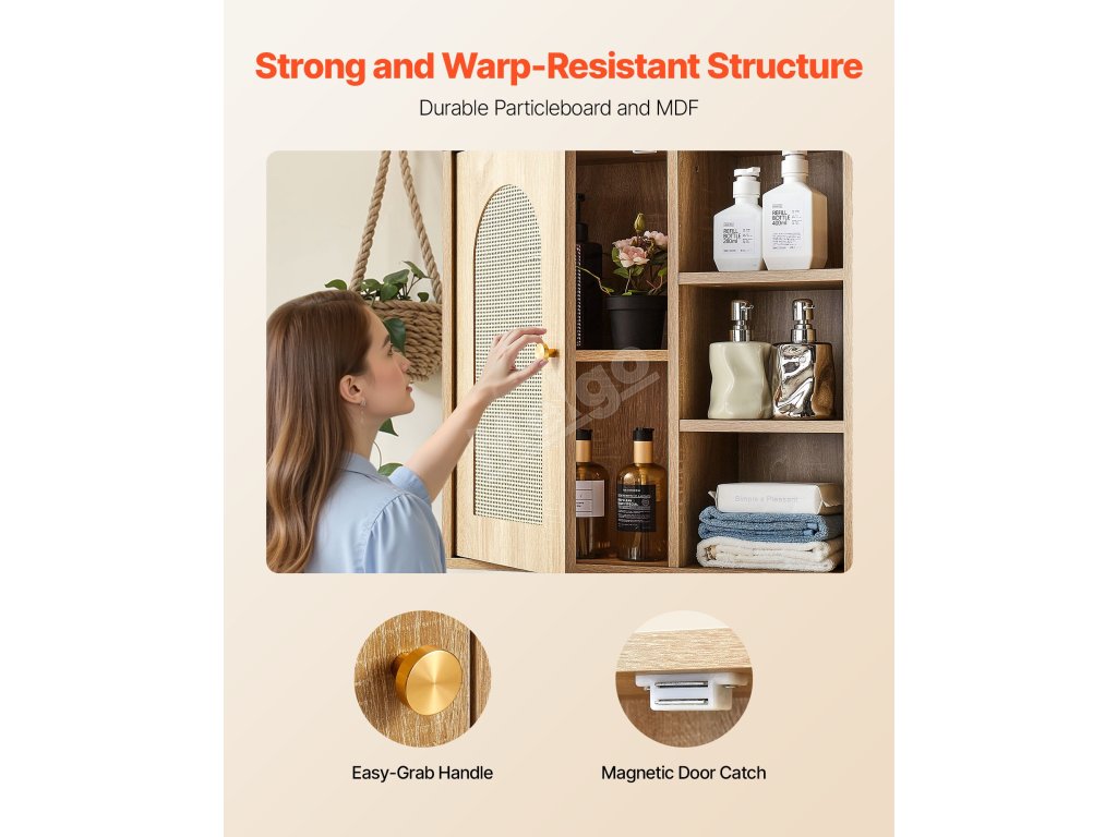 Naše závěsná koupelnová skříňka má pevný a odolný rám z dřevotřískových desek s hladkým magnetickým uzávěrem. Pohodlné úchyty a hladké hrany usnadňují otevírání a zabraňují nárazům. Police o tloušťce 0,6 palce zajišťují silnou nosnost a zůstávají dlouhodobě robustní a atraktivní.