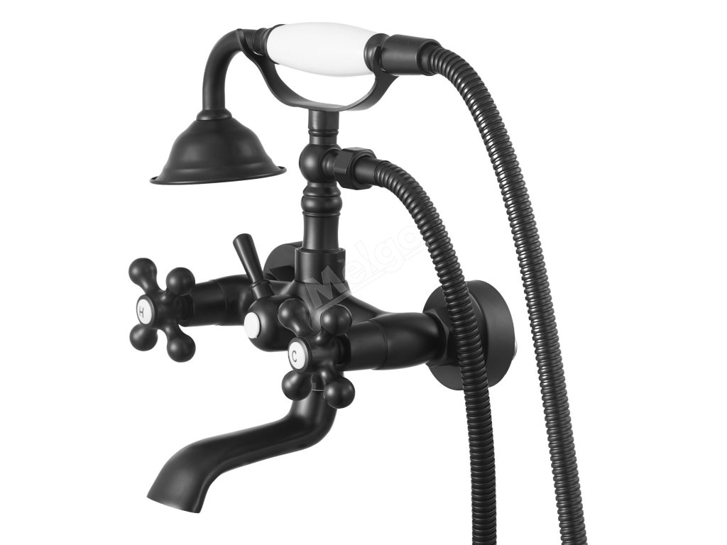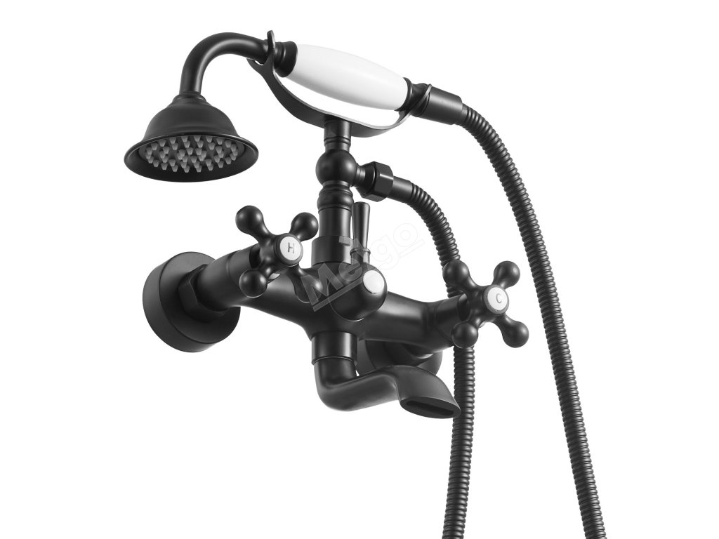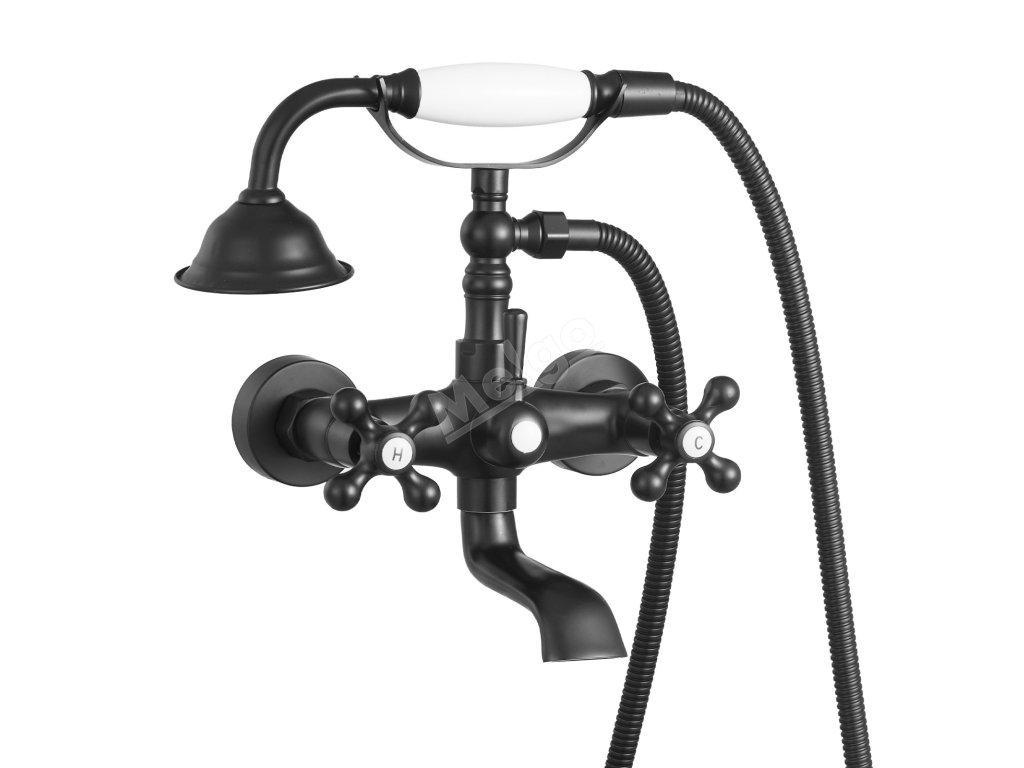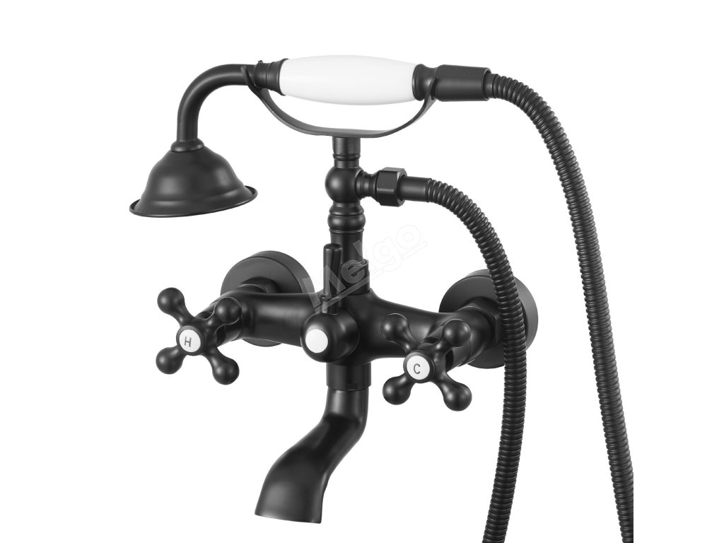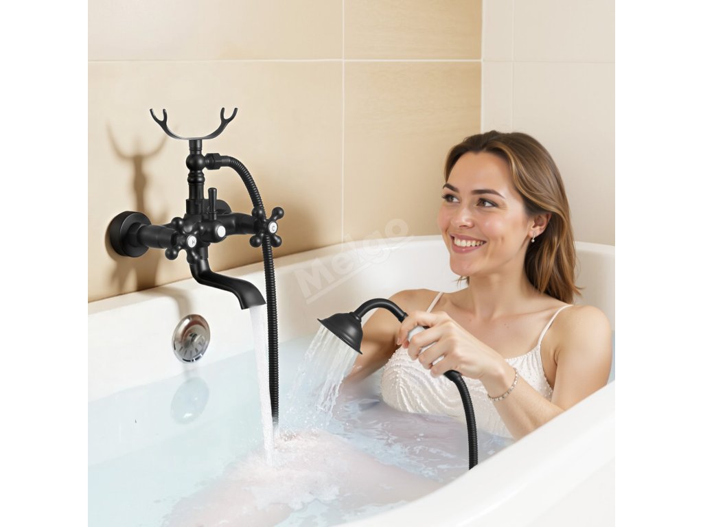 Nástěnná vanová baterie s ruční sprchou, matná černá, 360° výtok
