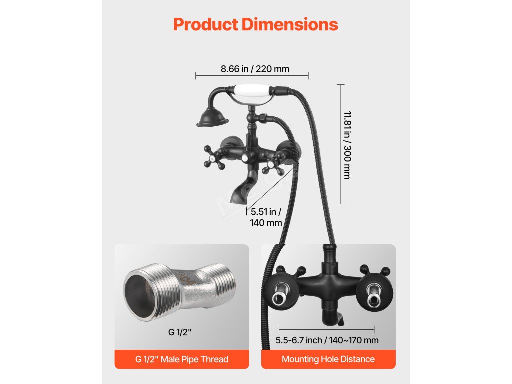 Přesná konstrukce se závitem a připevněnou teflonovou páskou zajišťuje pevnější a těsnější utěsnění. Snadná instalace díky vnějšímu trubkovému závitu G 1/2" a nastavitelným kyvným ramenům, která zajišťují vzdálenost mezi montážními otvory od středu k středu 5,5 - 6,7 palce (140 - 170 mm).