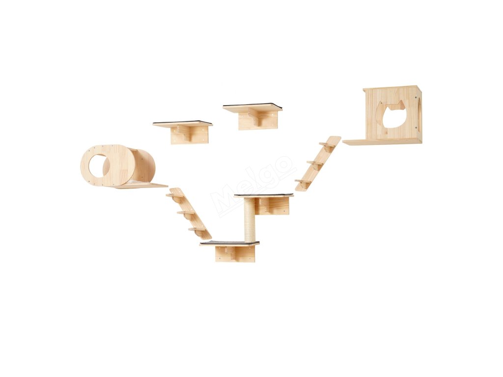Naše nástěnná police pro kočky obsahuje 2 skákací desky, 2 hnízda pro kočky, 2 houpací sítě a 1 kočičí strom, které splňují různé potřeby pro lezení, zábavu, odpočinek a škrábání a obohacují hru vaší kočky.