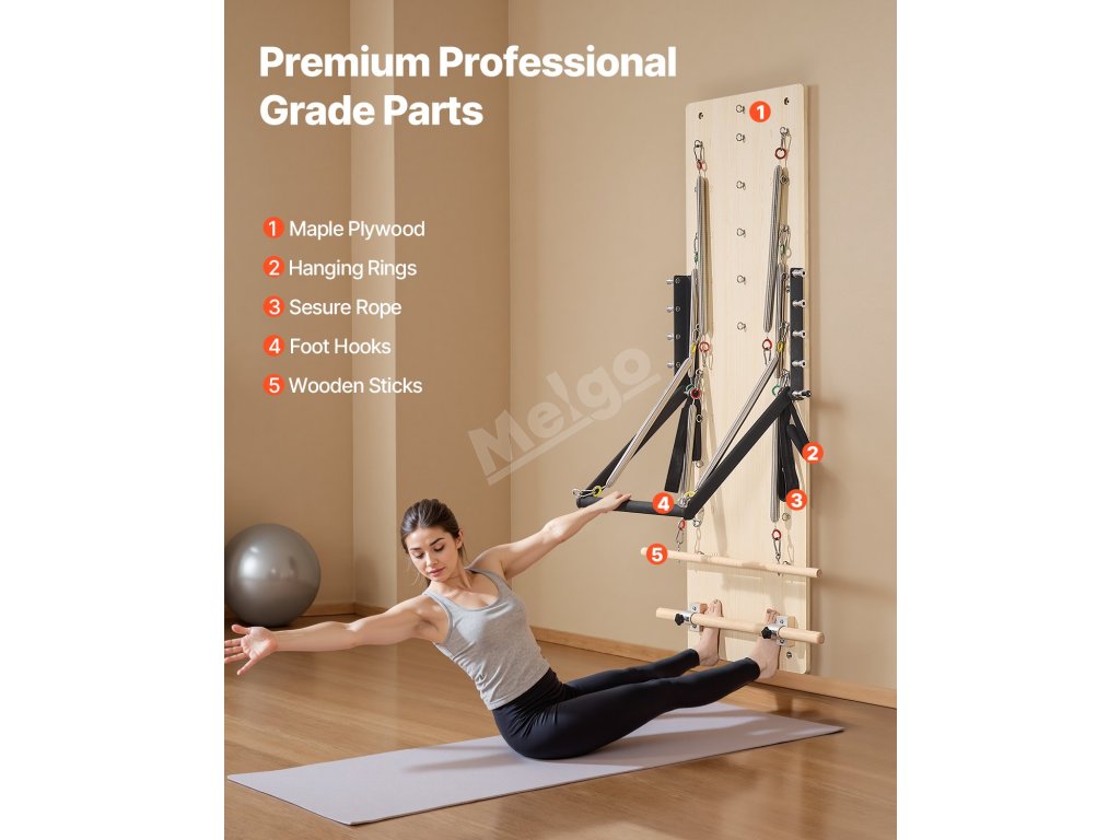Vybavení pro pilates je vyrobeno z přírodního, odolného dřeva s pevnou konstrukcí, která vyhovuje každodenním tréninkovým potřebám. Používá bílé masivní dřevo pro estetičtější design.