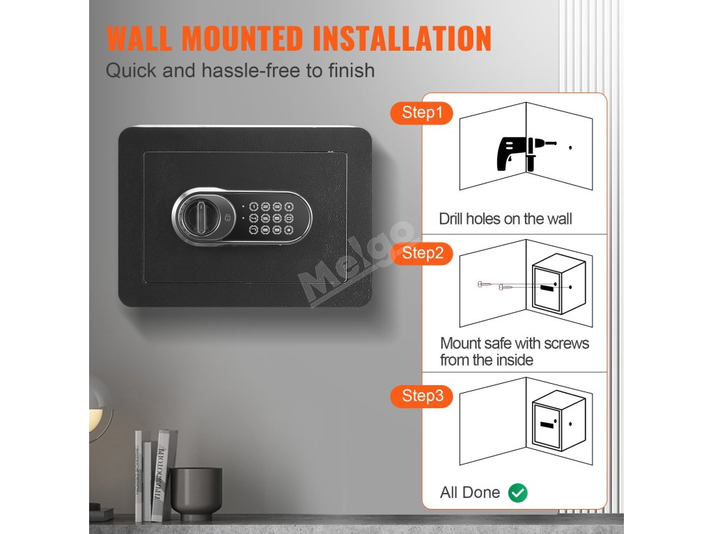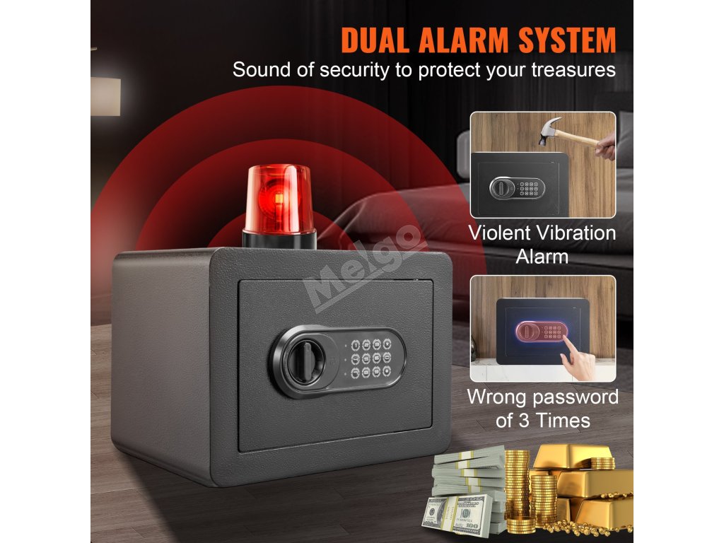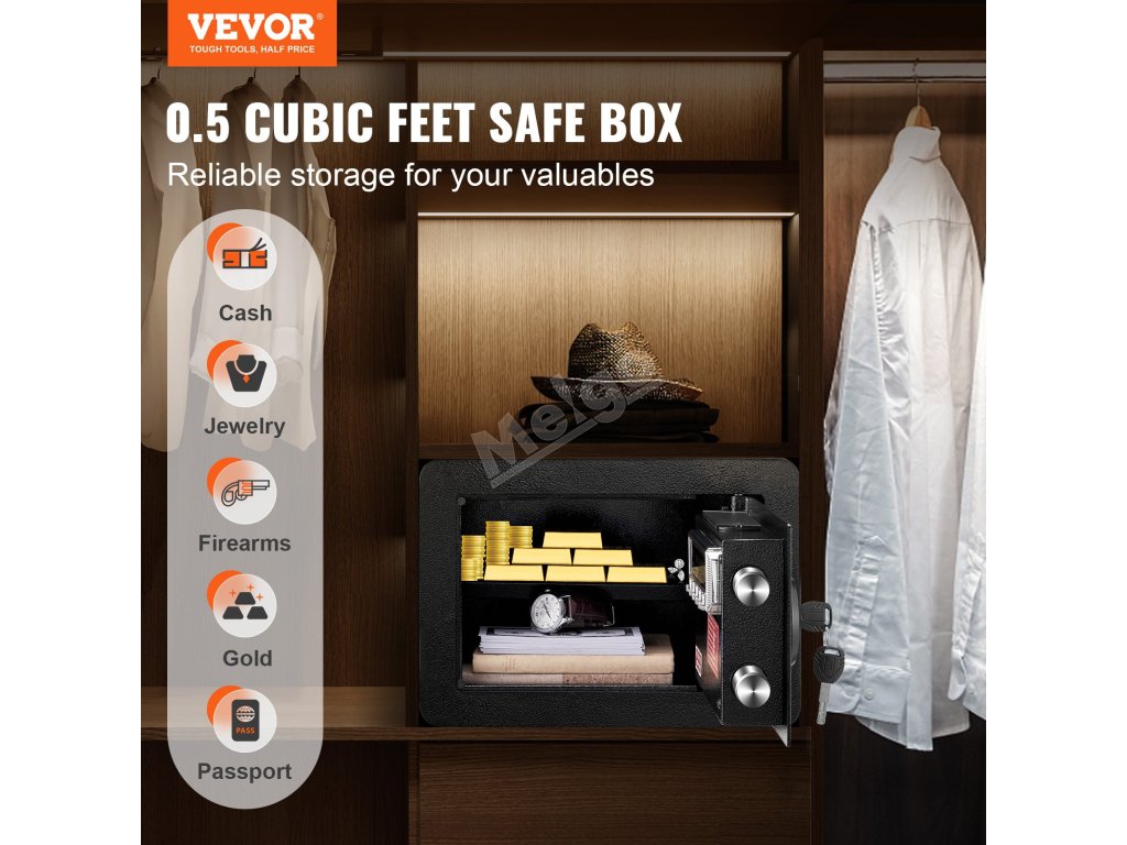 Trezor VEVOR má zvonku kompaktné rozmery 13,8 x 9,8 x 9,8 palca. Vďaka malým rozmerom sa zmestí do rôznych priestorov, od spální až po kancelárie. Predvŕtané otvory na bokoch a zadnej strane uľahčujú upevnenie trezora na steny alebo podlahu. Táto funkcia zvyšuje jeho bezpečnosť tým, že zabraňuje ľahkej krádeži alebo premiestneniu. Zvládnuteľná veľkosť a hmotnosť trezora uľahčujú jeho inštaláciu bez odbornej pomoci. Bez ohľadu na to, či potrebujete uložiť hotovosť, dôležité dokumenty alebo iné cennosti, veľkosť a jednoduchá inštalácia tohto trezora z neho robia jednoduchšiu voľbu do každej miestnosti.